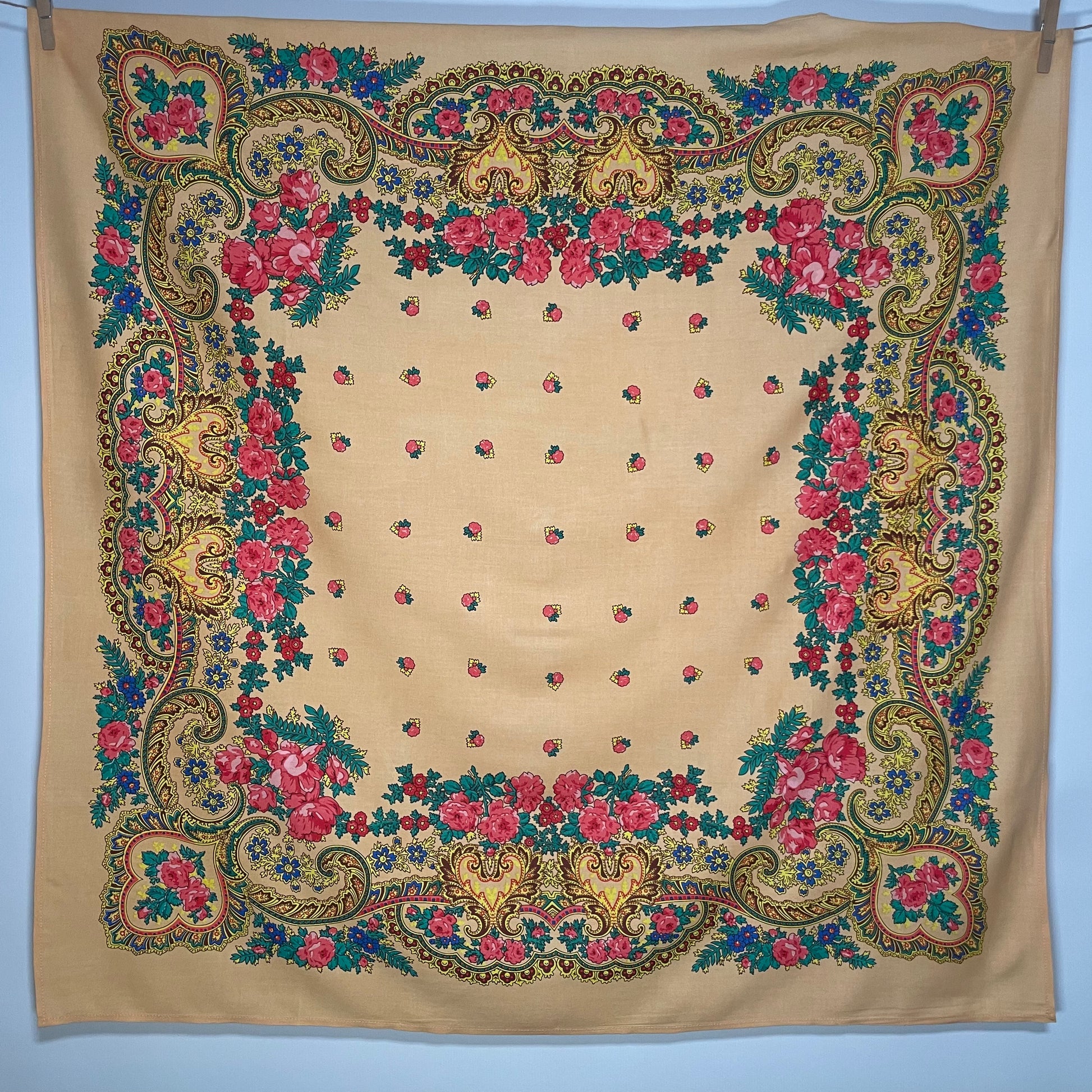 Mantón vintage italiano 100% Lana Pura en colores crema, caldero, mostaza y morado 115 x 115 cm