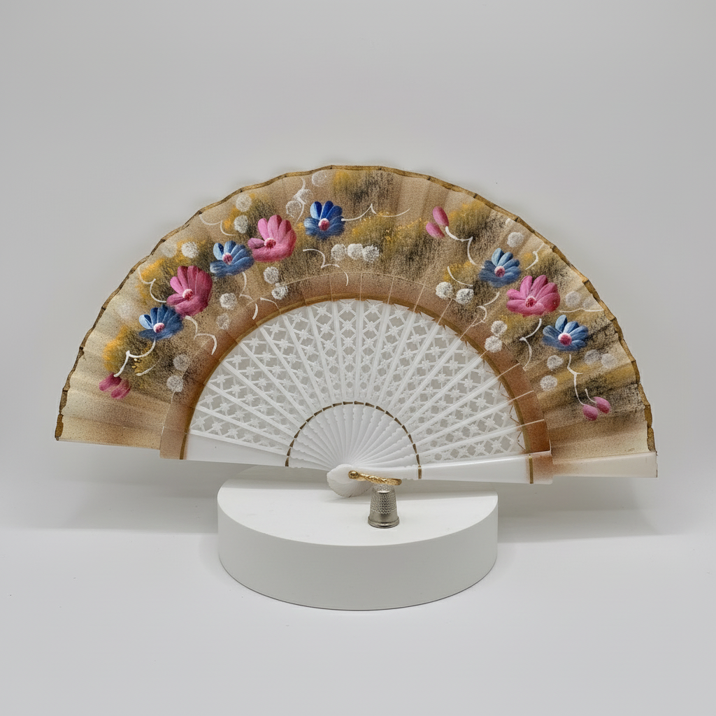 Abanico de bolso de plástico calado color nácar y pintado a mano.
