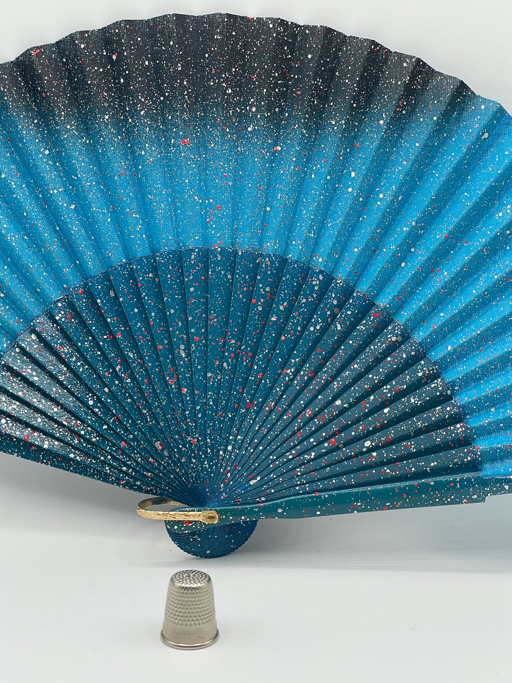 único abanico de madera alños 80 color azul ceniza, pintado a mano