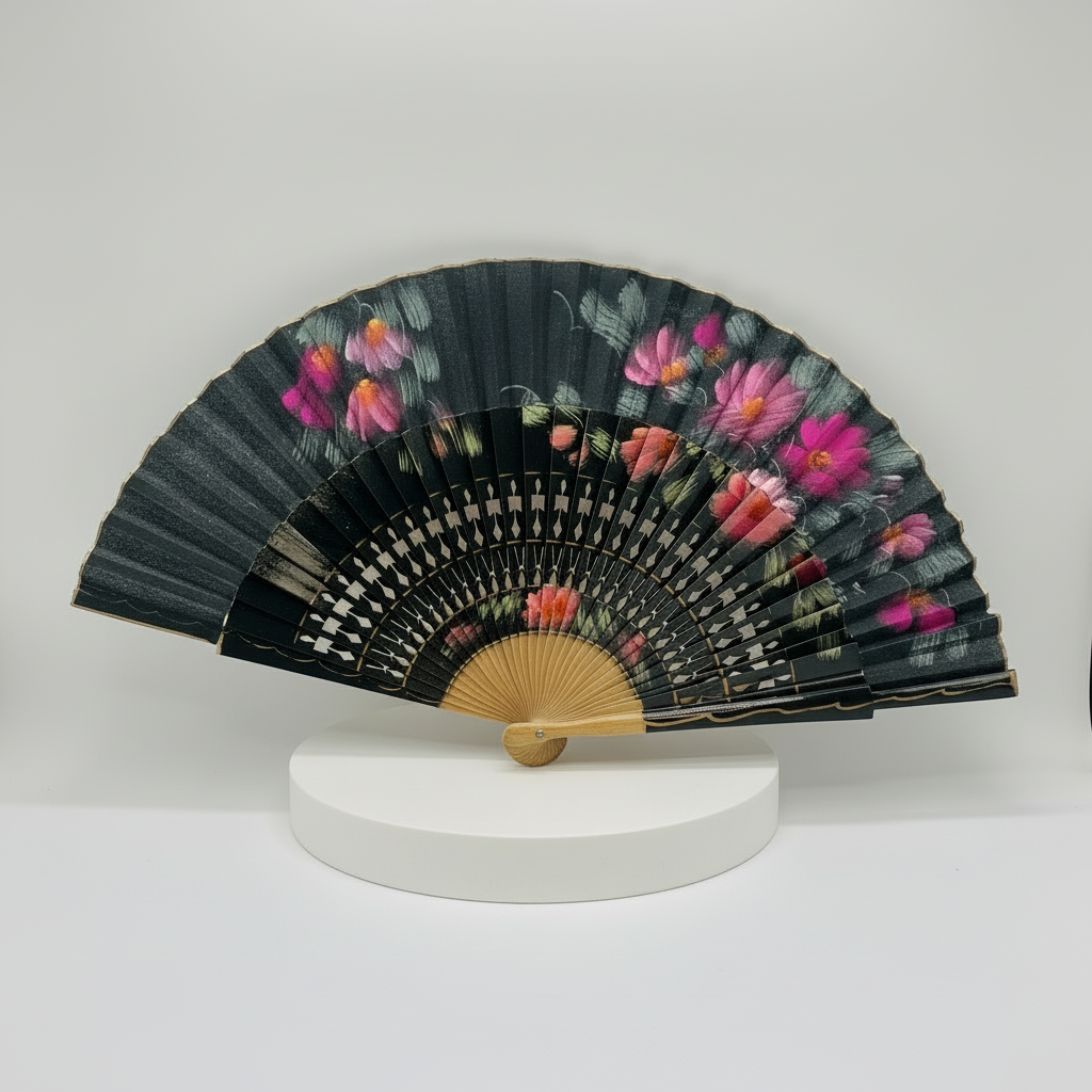 Abanico de madera calado color negro y pintado a mano con motivos florales.