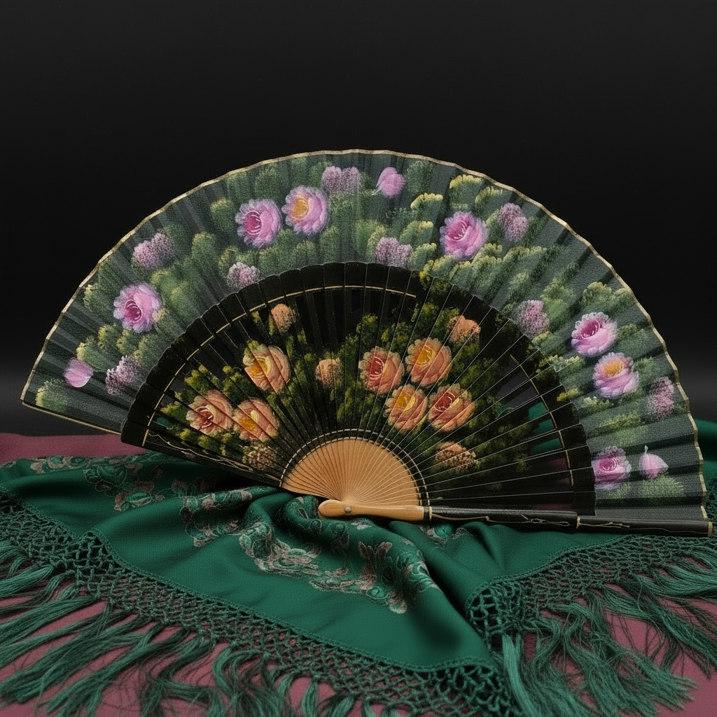 Abanico de madera calado color negro y pintado a mano con motivos florales.