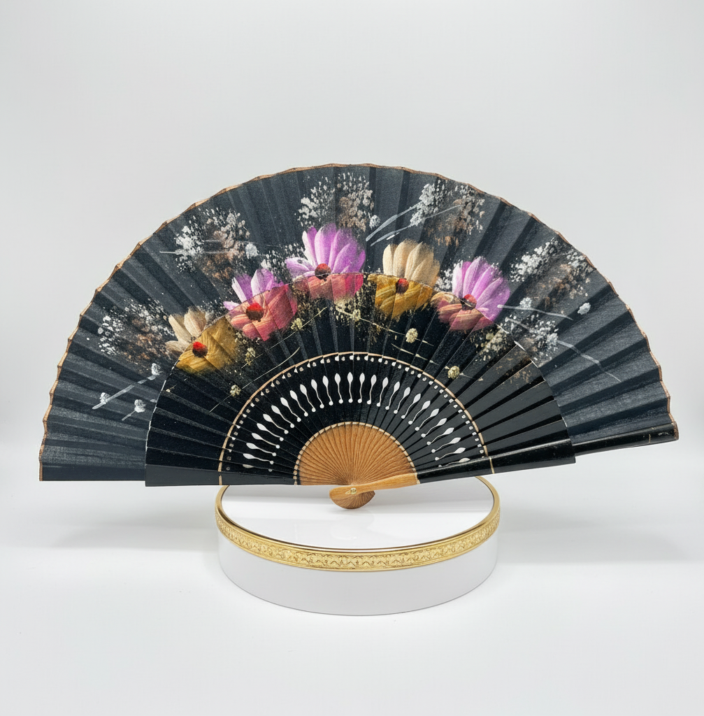 Abanico de madera calado color negro y pintado a mano con motivos florales.