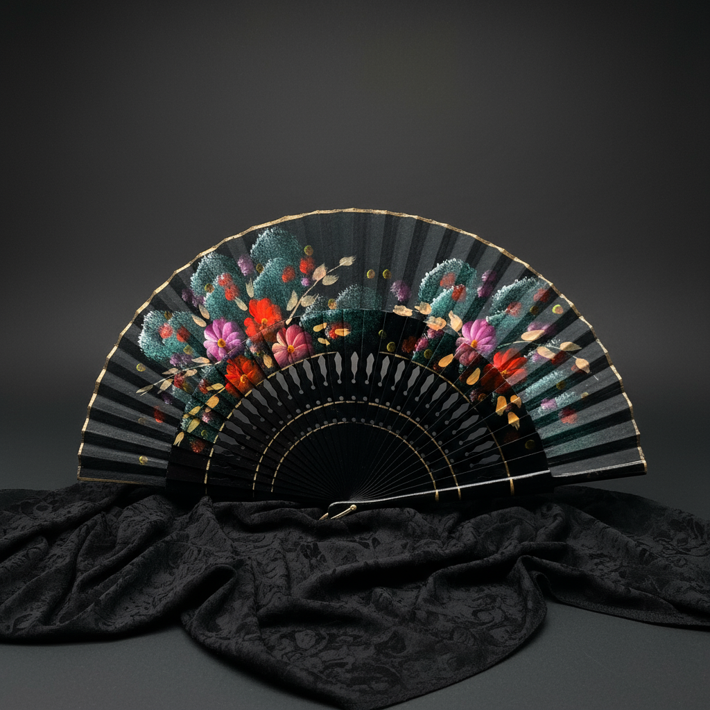 Elegante y único abanico de madera calado color negro, pintado a mano con motivos florales.