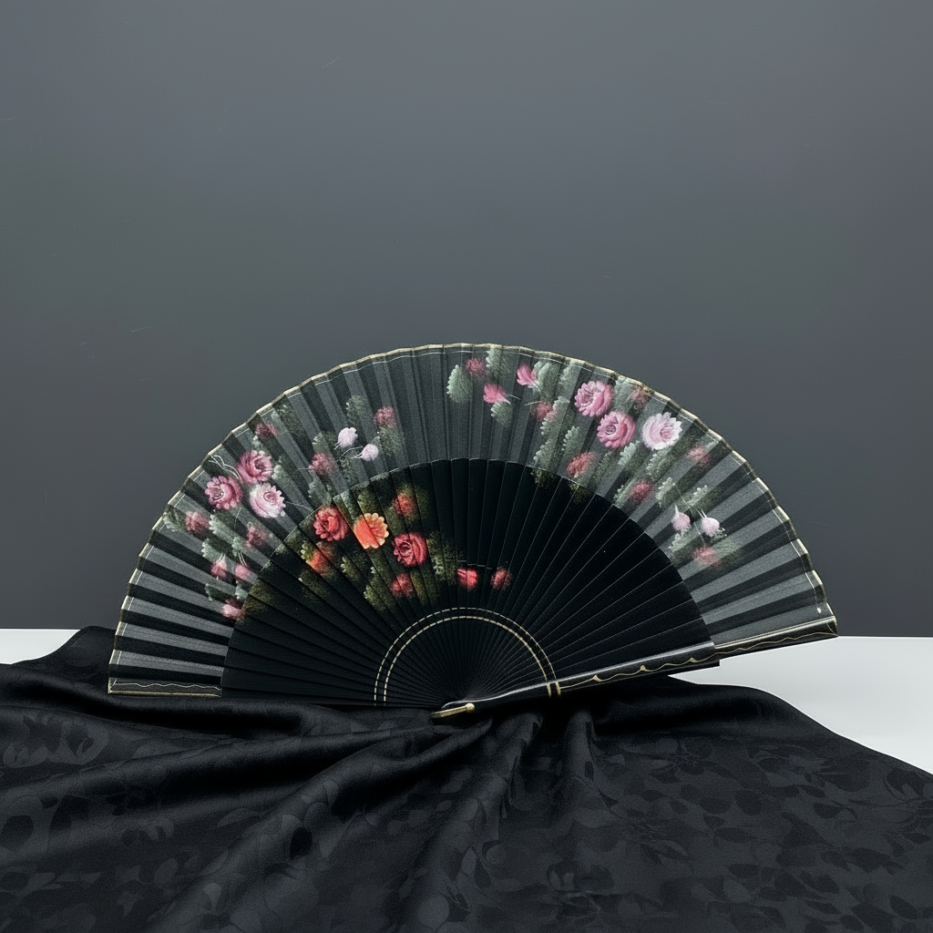 Abanico de madera color negro y pintado a mano con motivos florales.