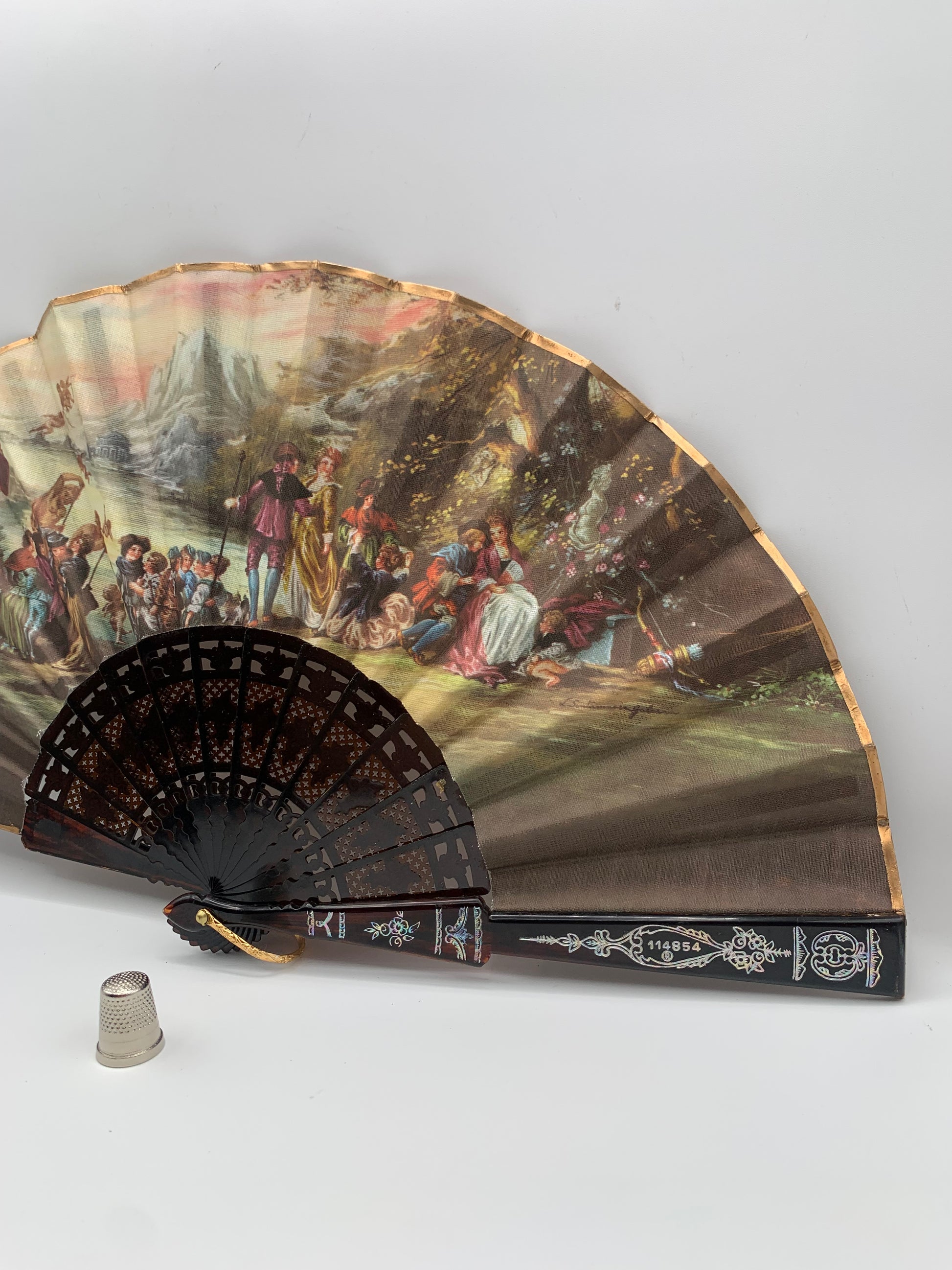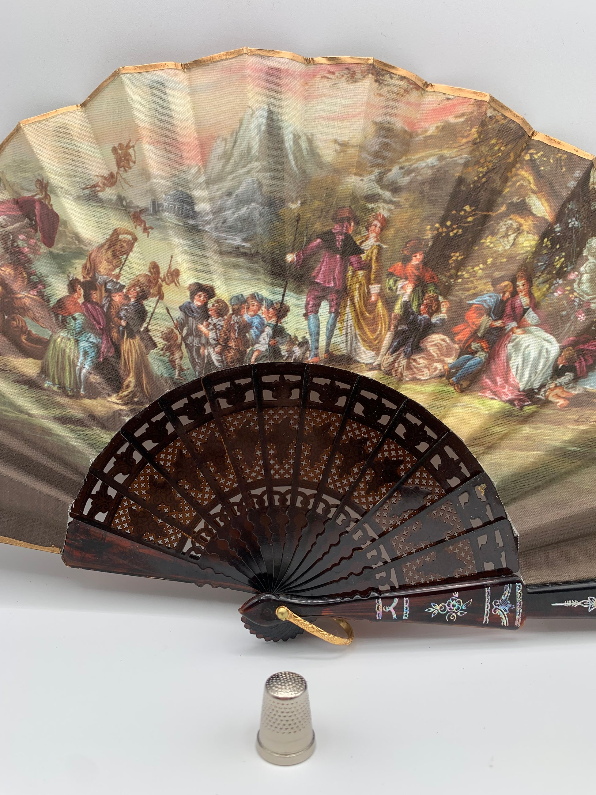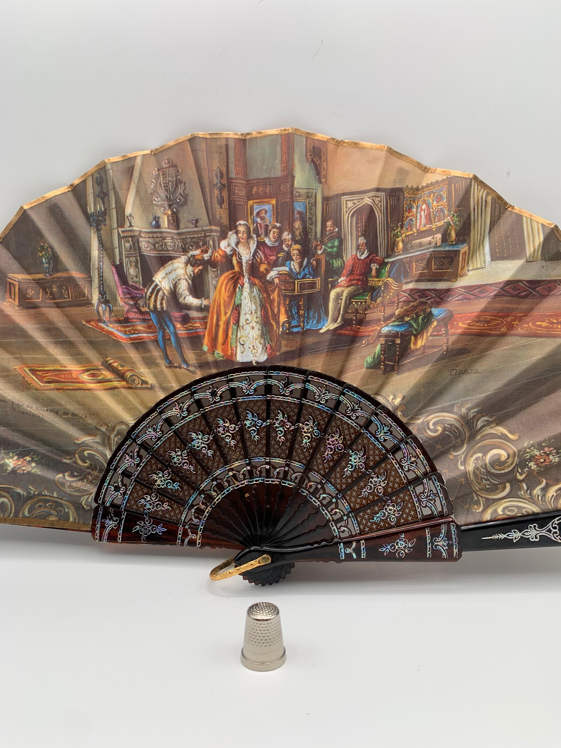 Abanico de pasta calado color carey e imagen impresa de época por ambas caras