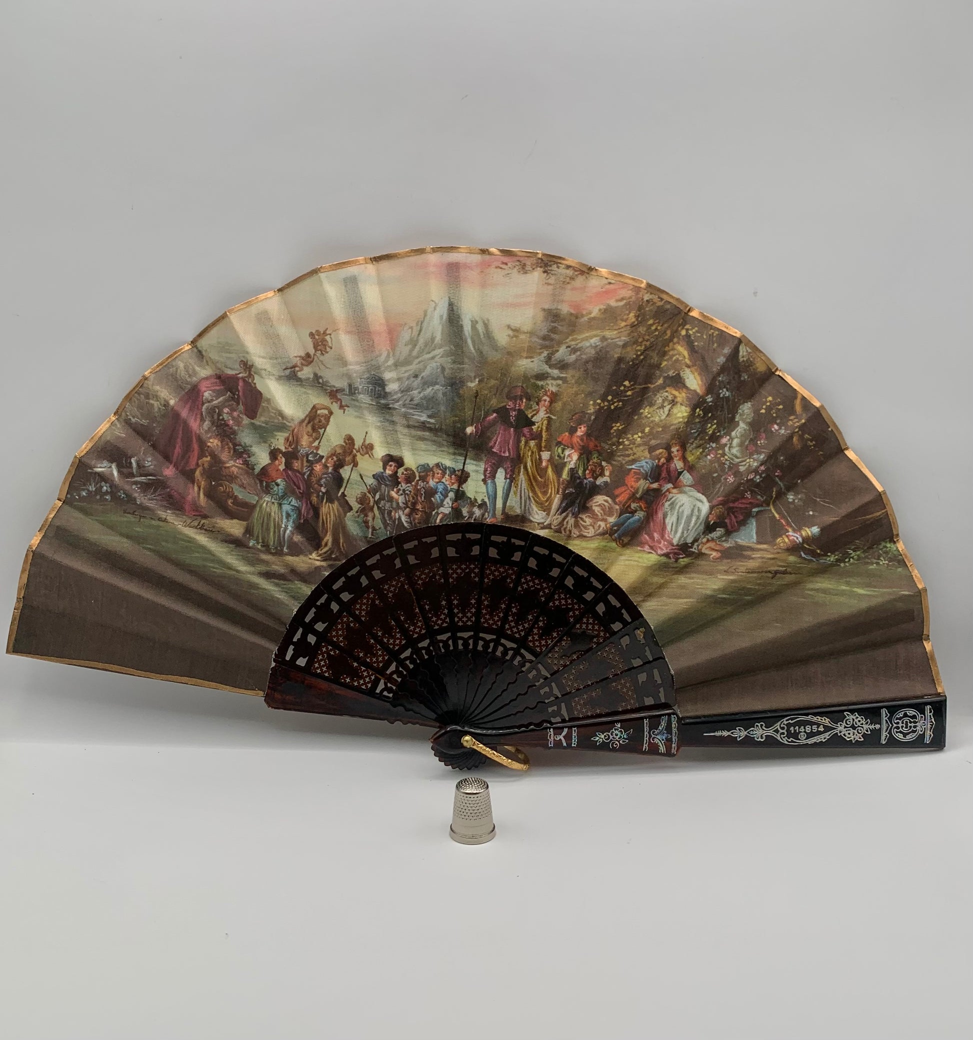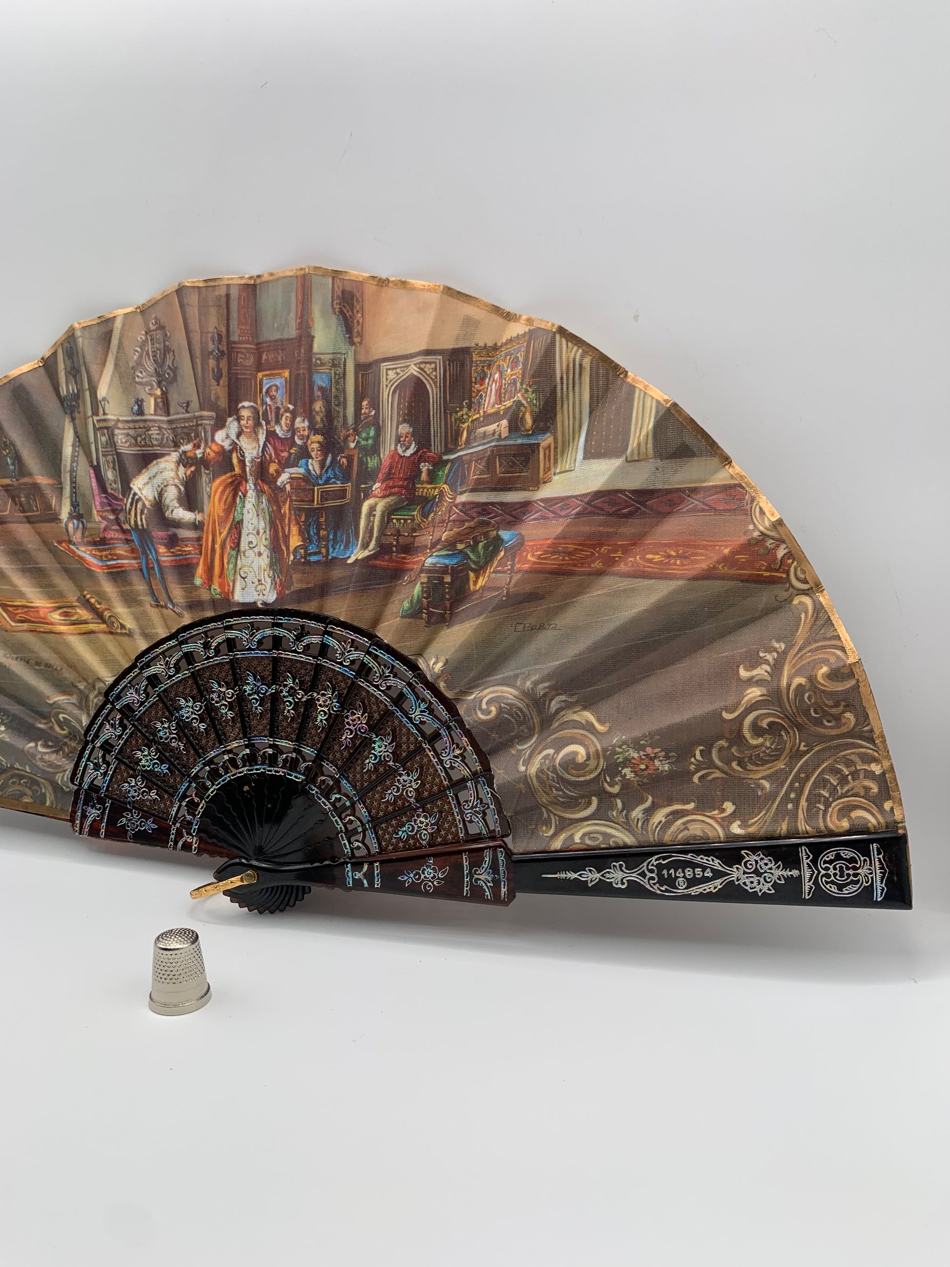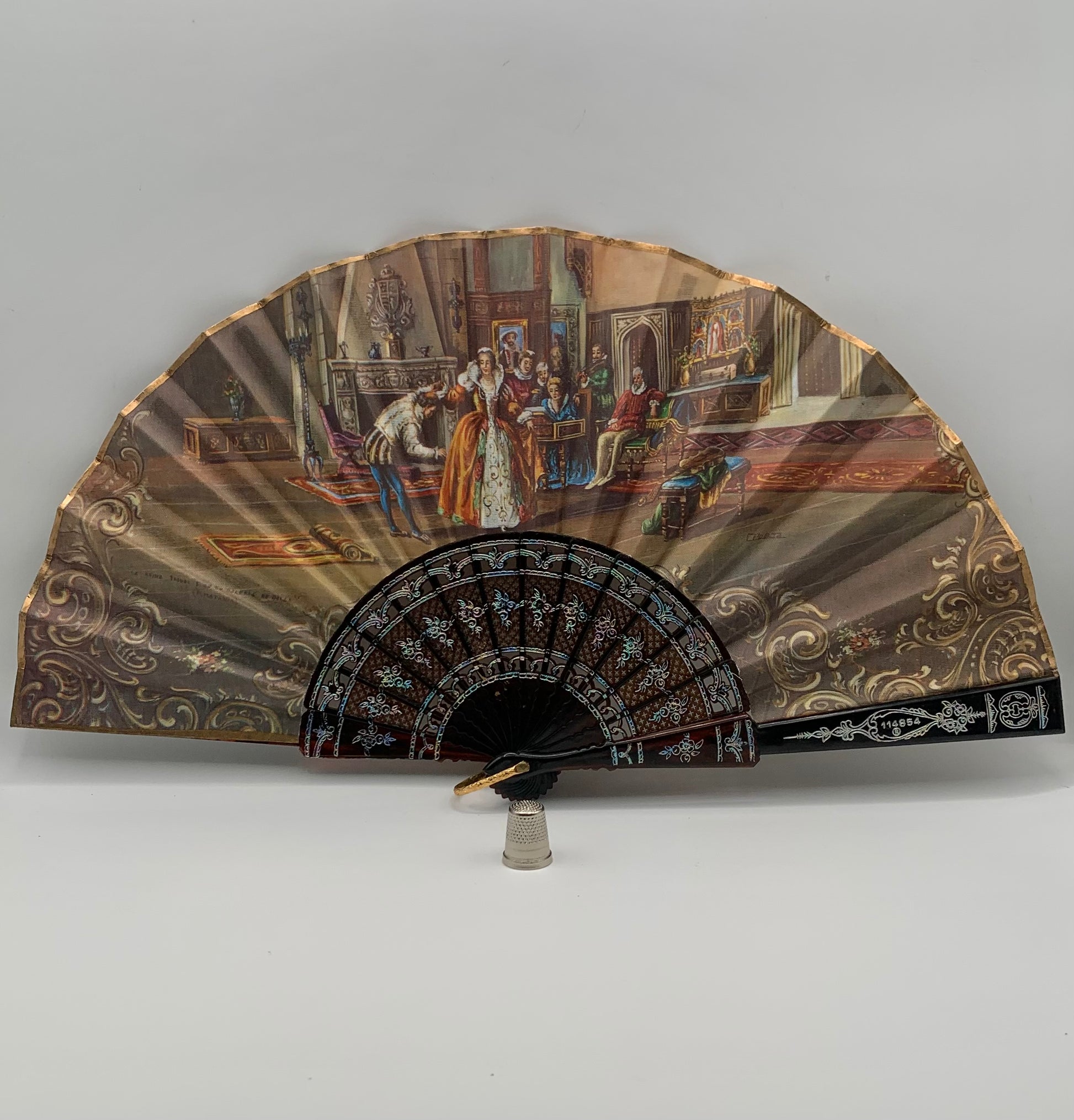 Abanico de pasta calado color carey e imagen impresa de época por ambas caras