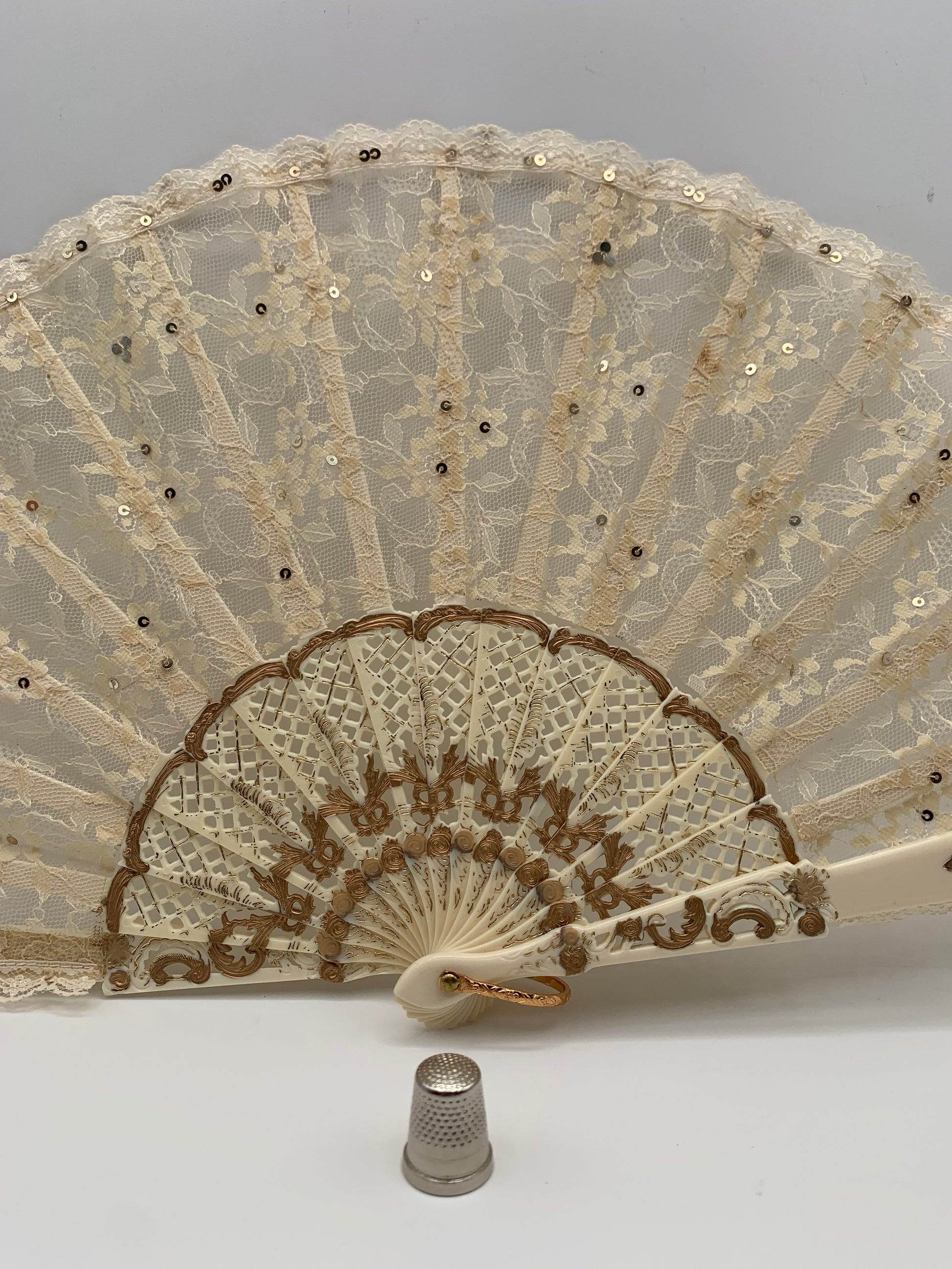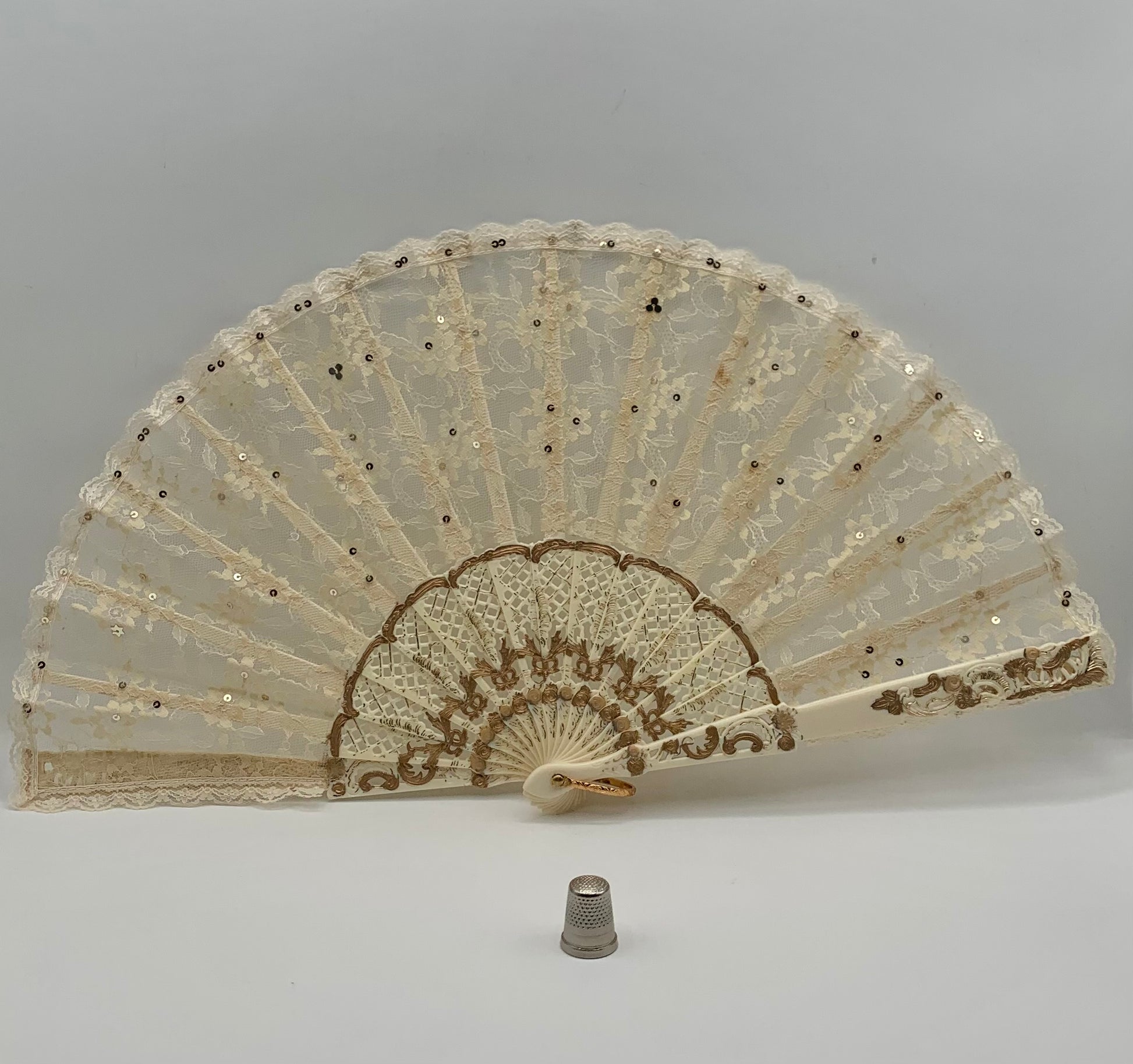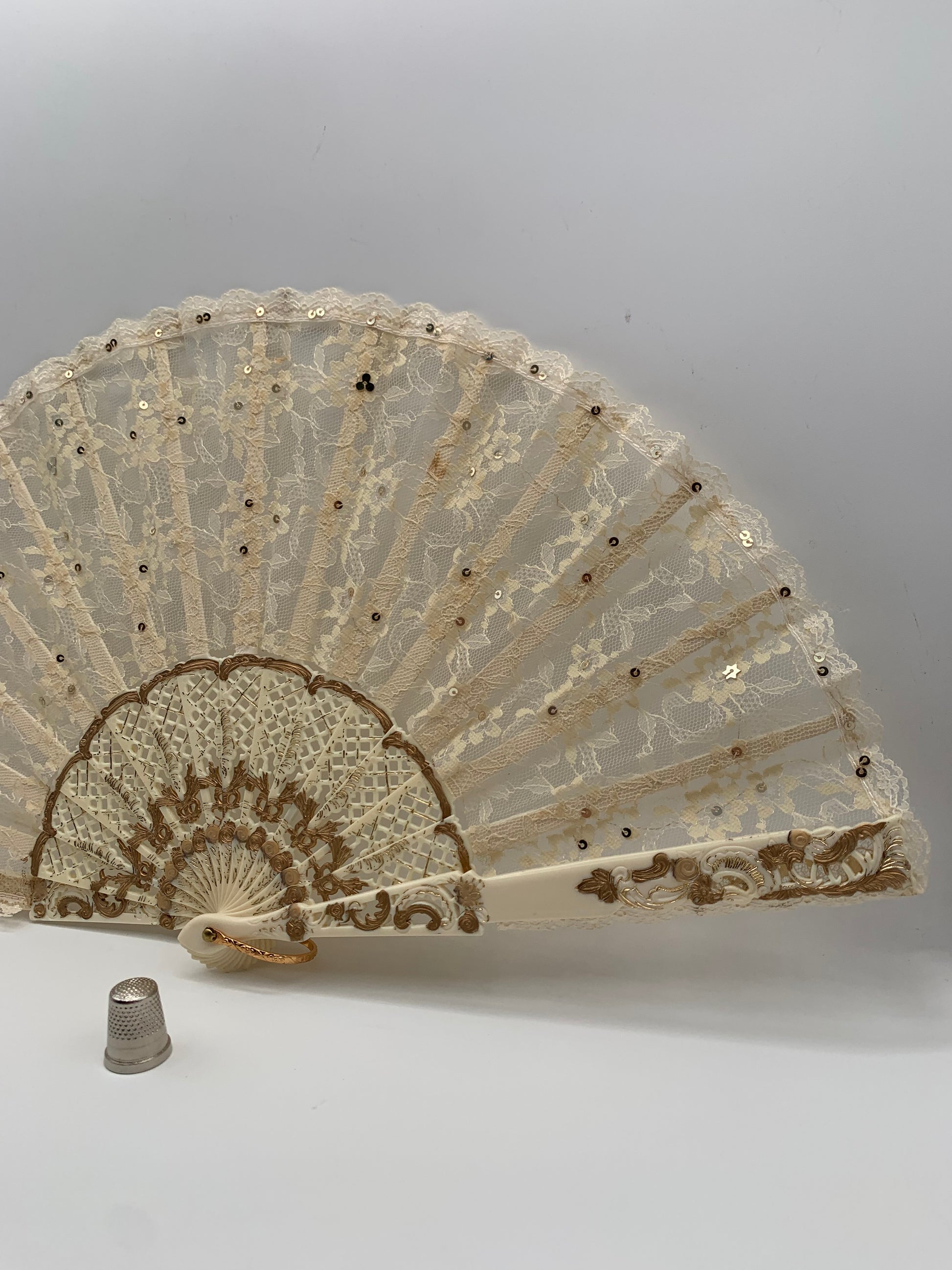 Abanico de pasta calado color crema y encaje beige con lentejuelas