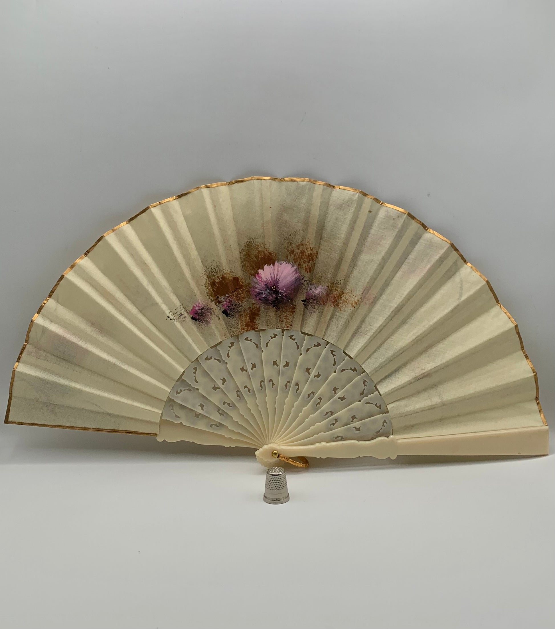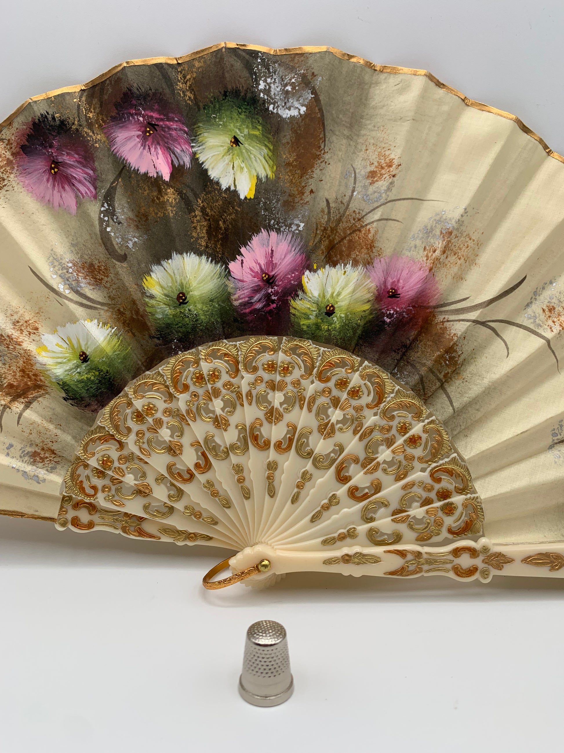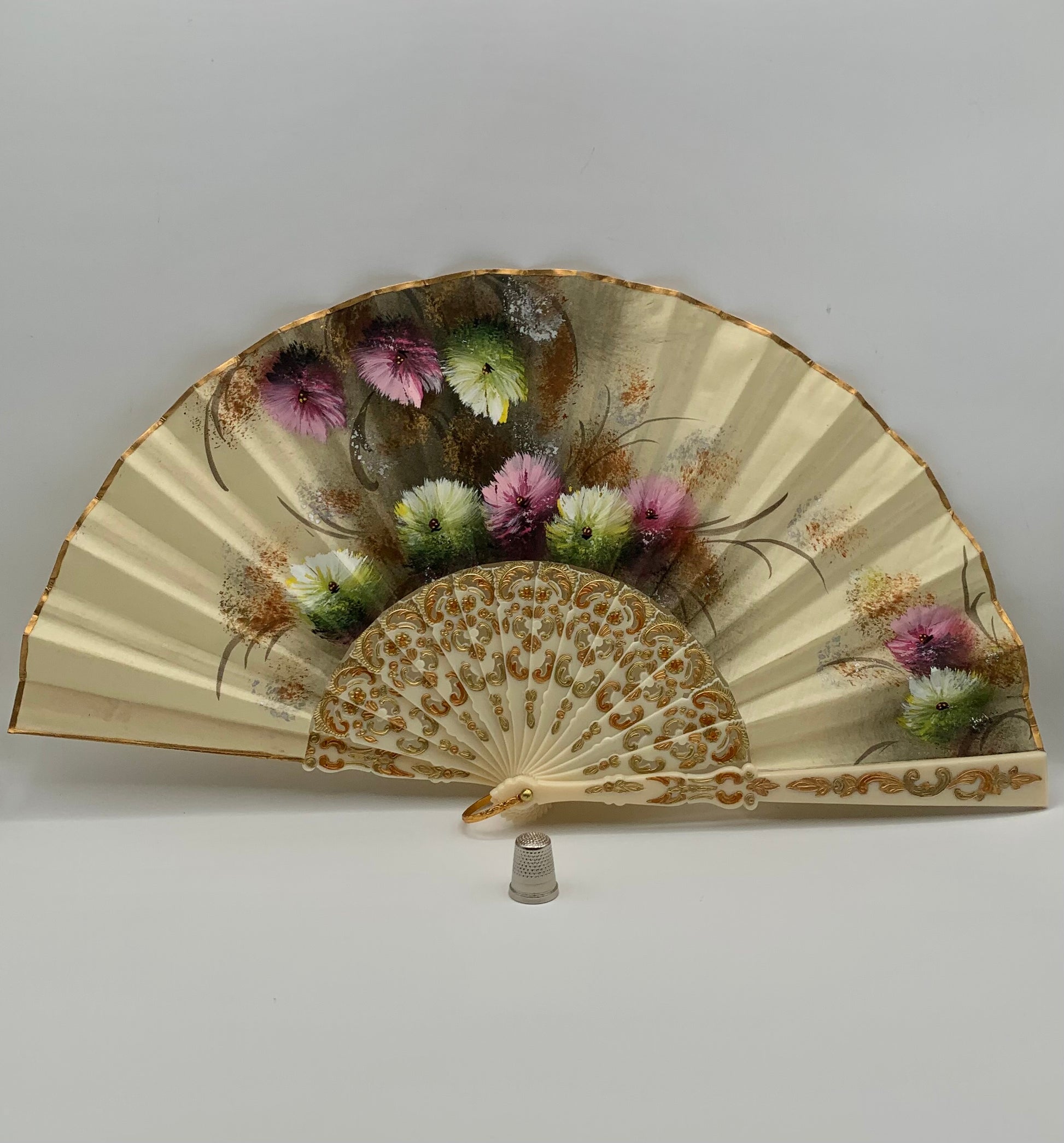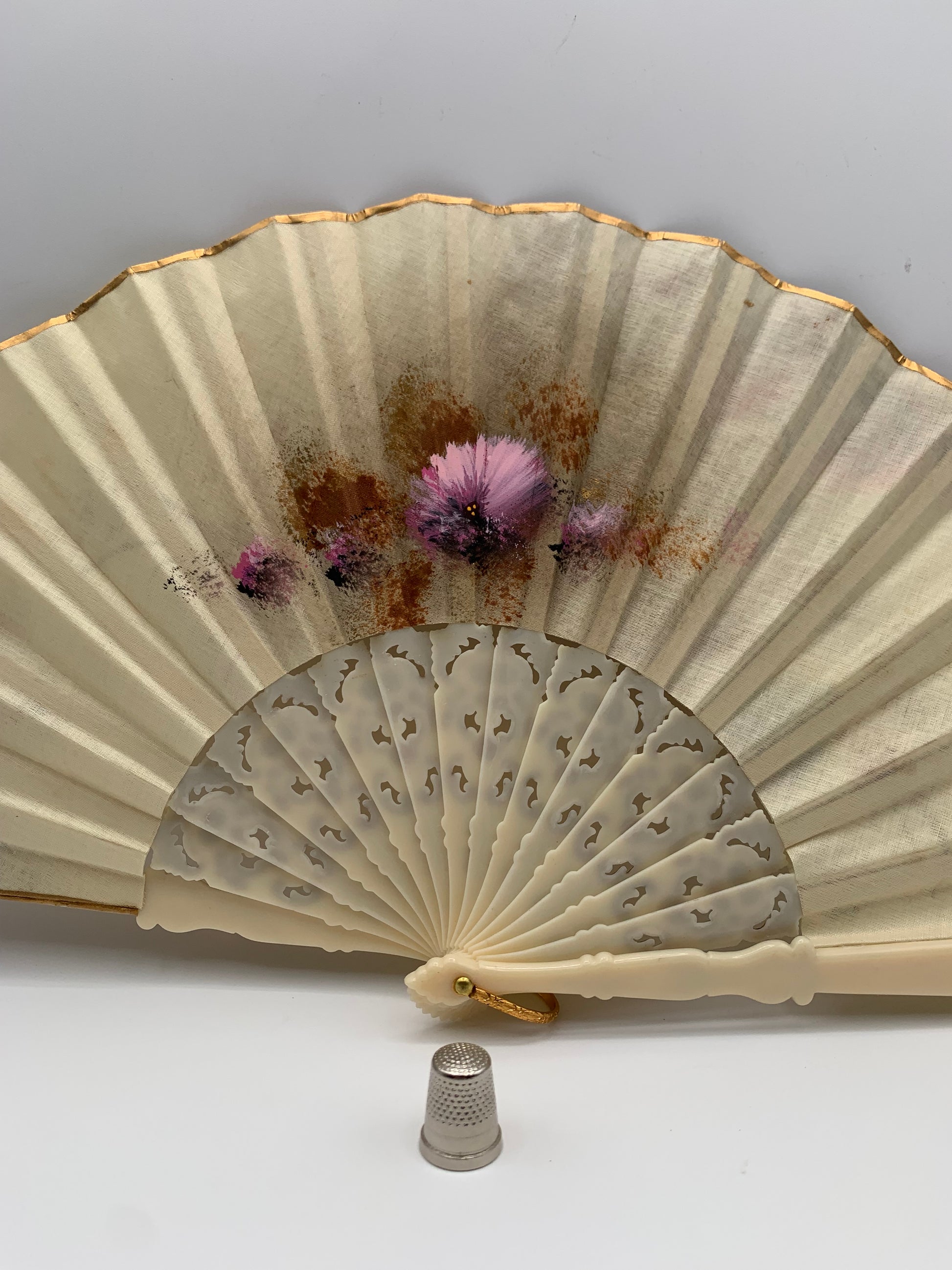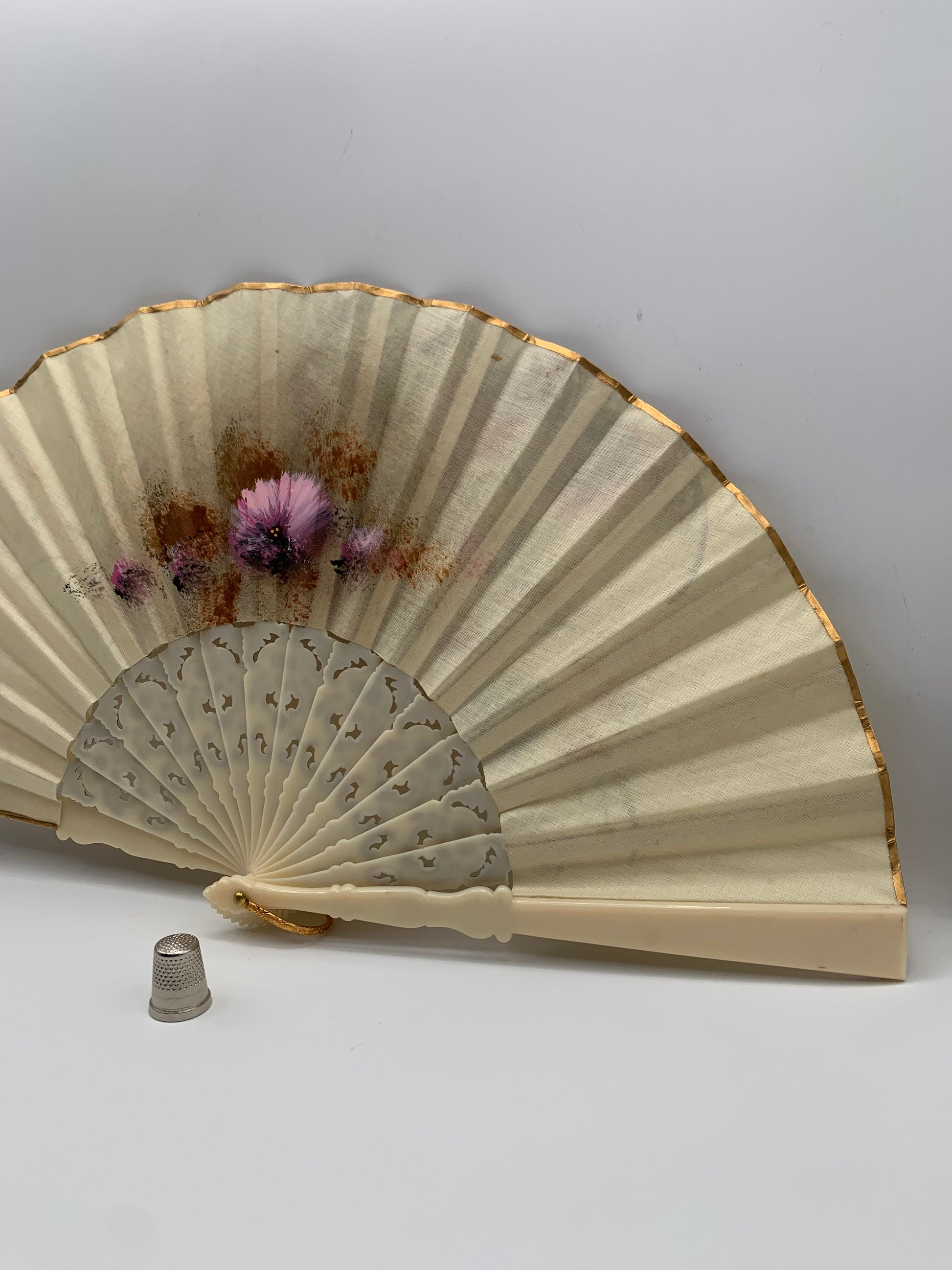 Abanico de pasta calado color crema y pintado a mano por ambas caras