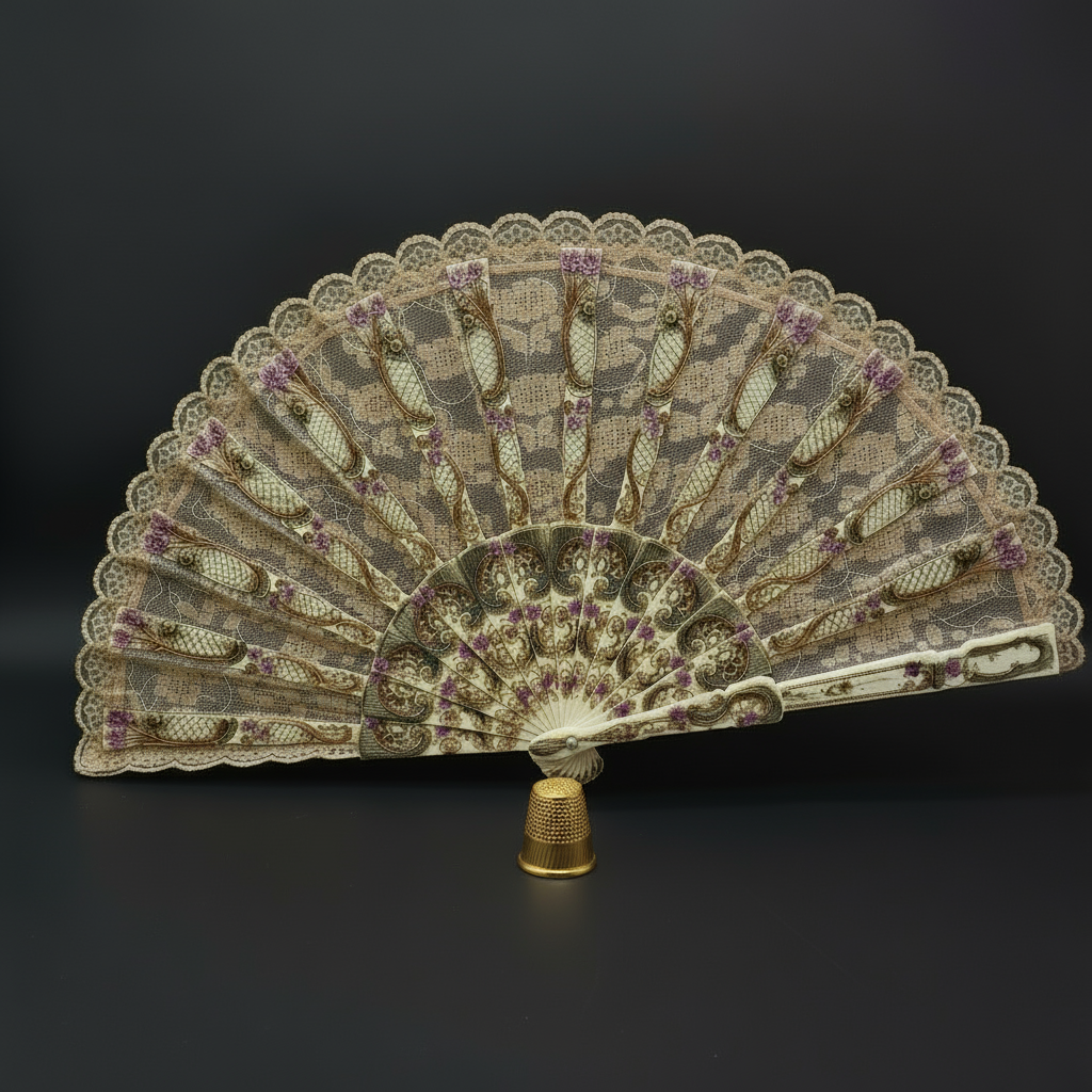 Abanico de pasta calado color nácar y encaje beige con filigranas doradas.