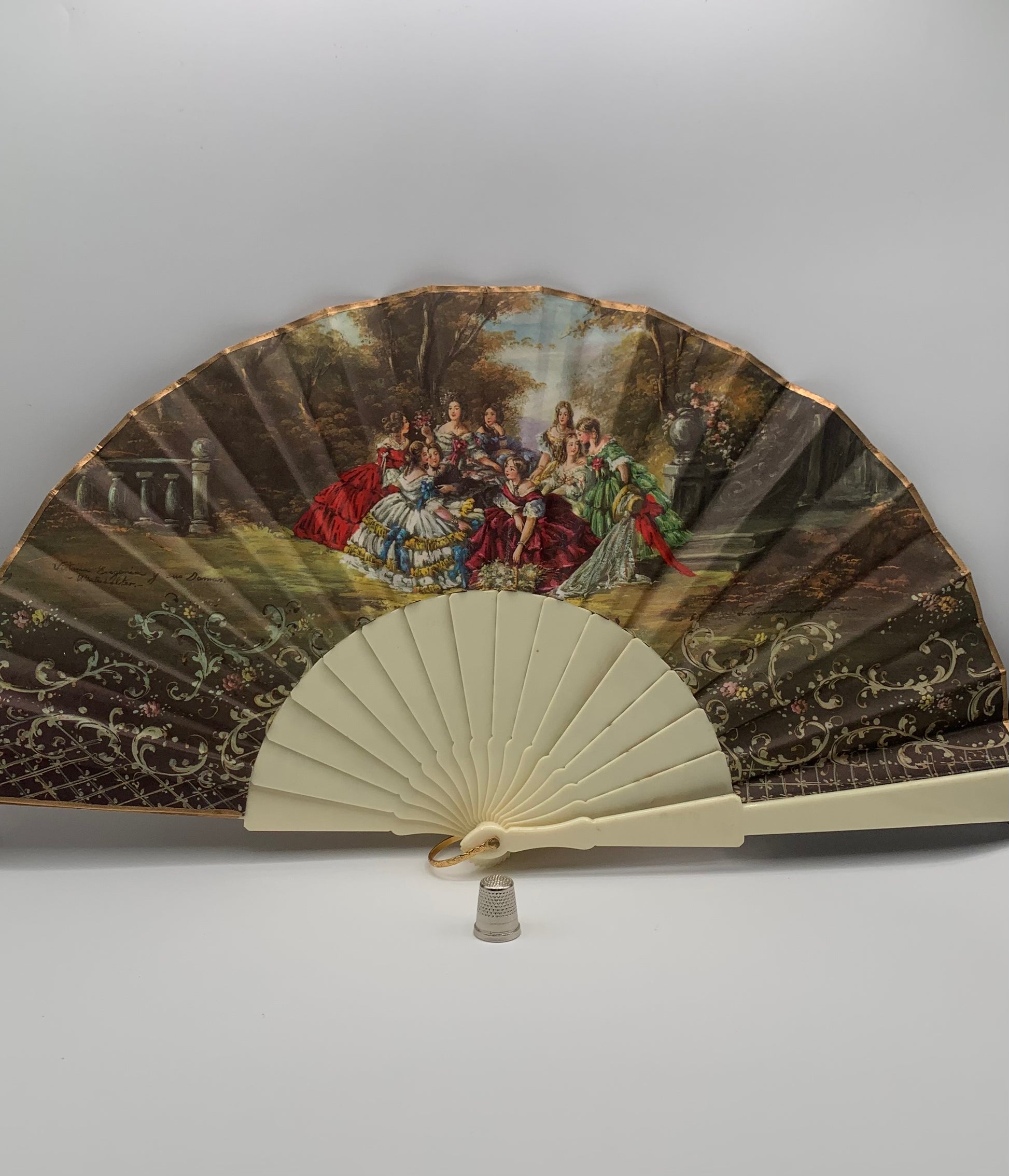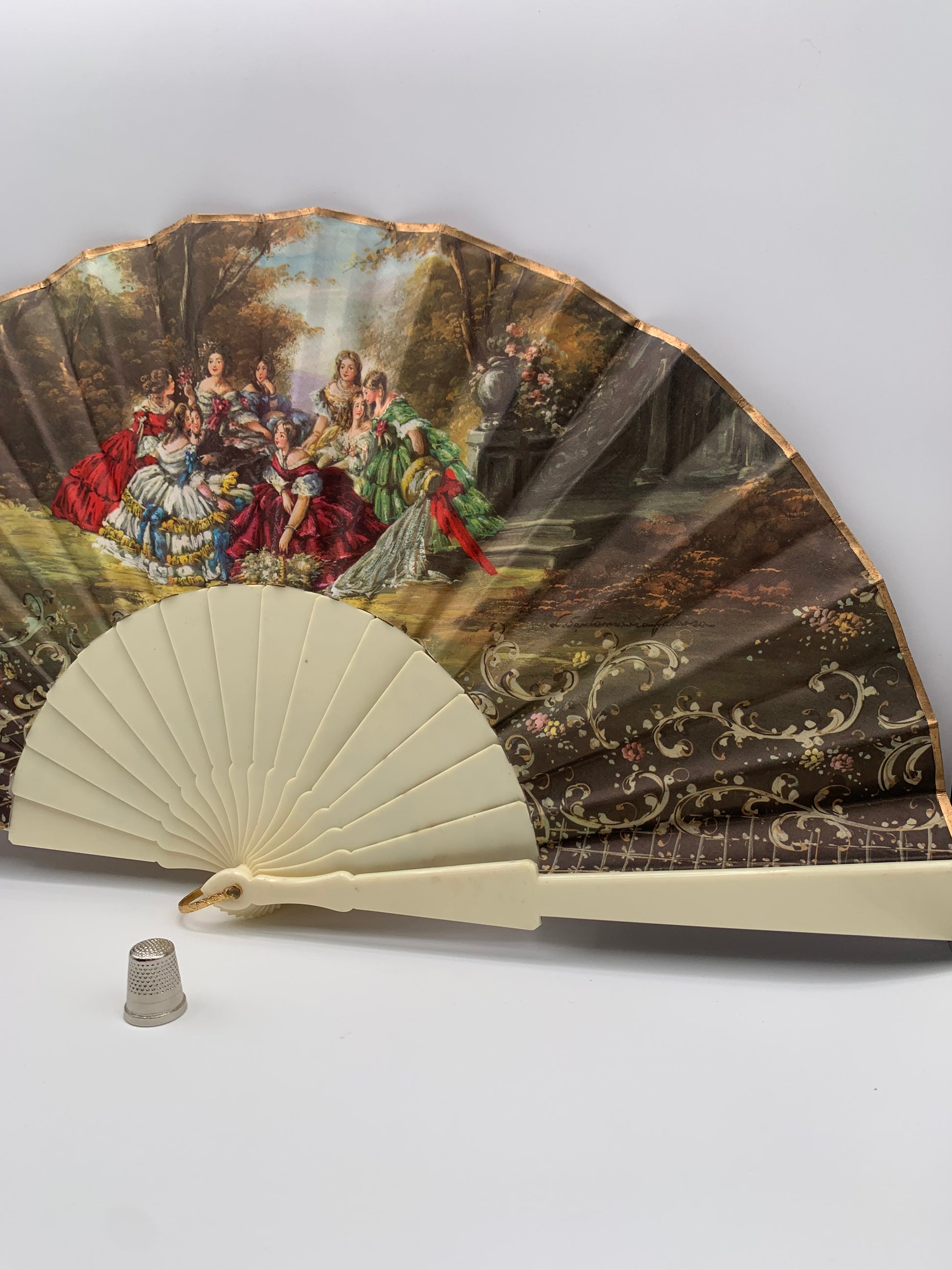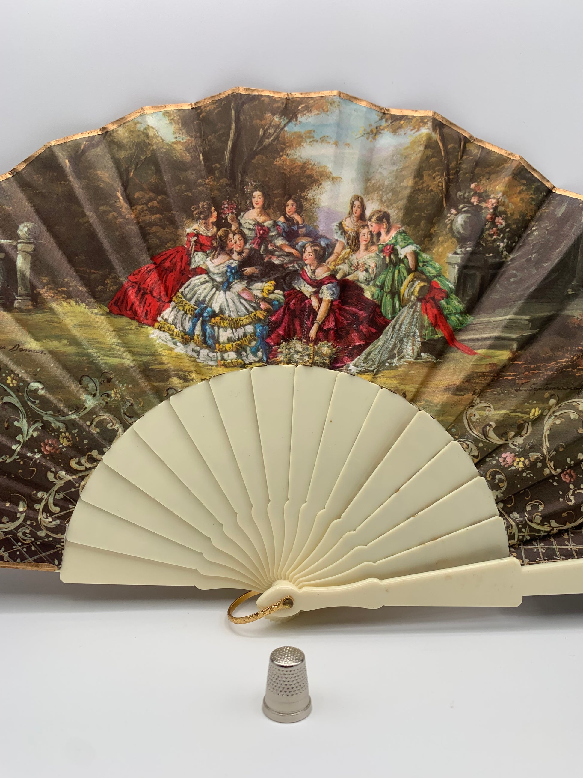 Abanico de pasta color blanco nácar e imagen de época impresa por ambas caras