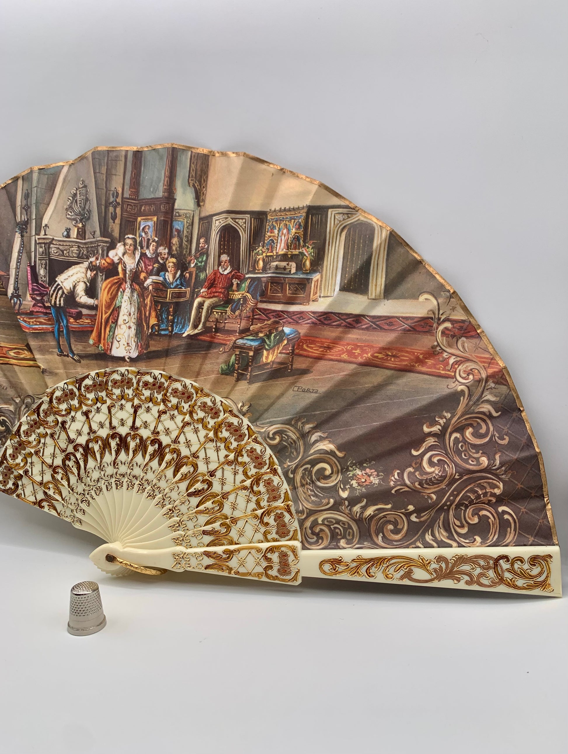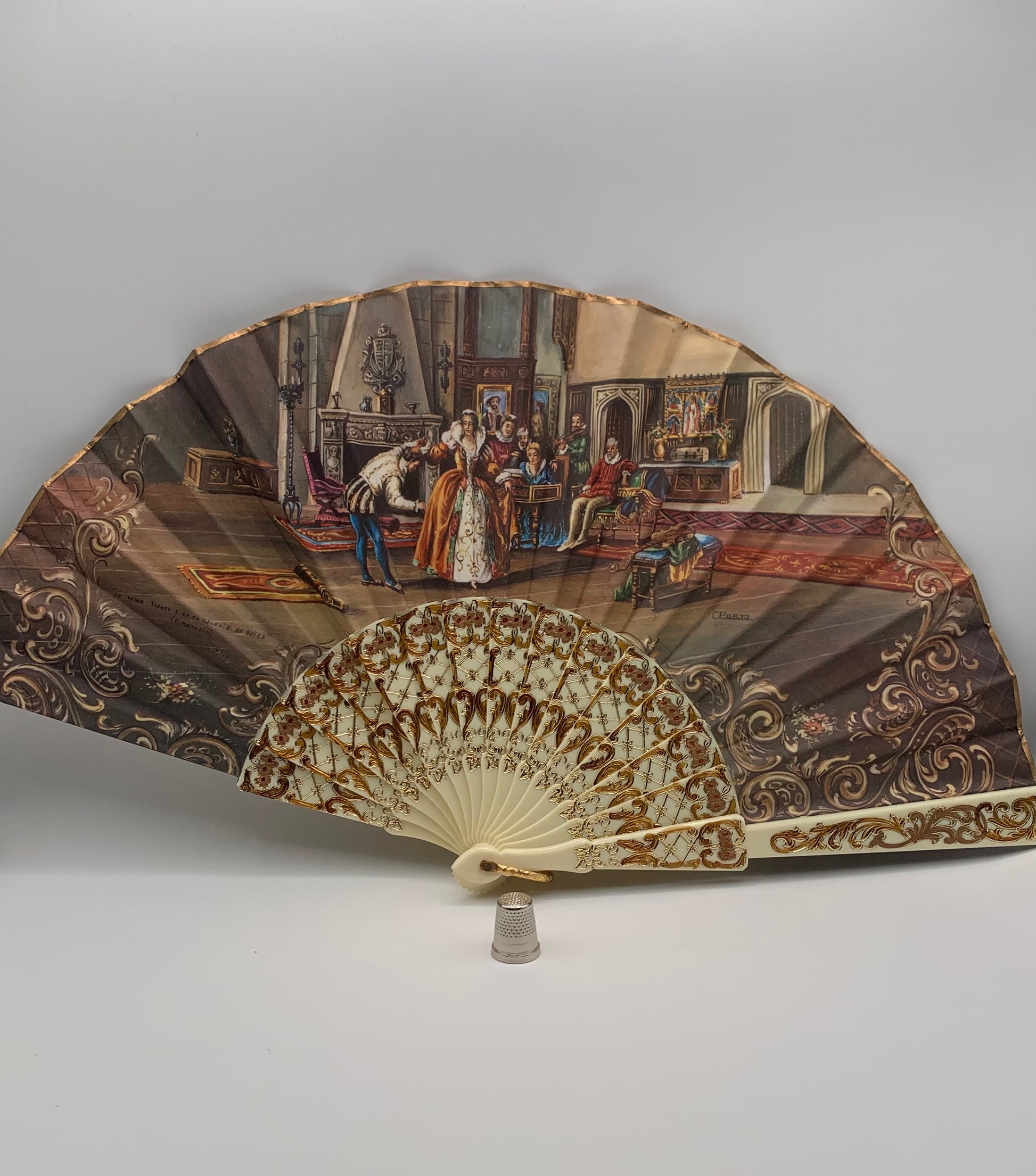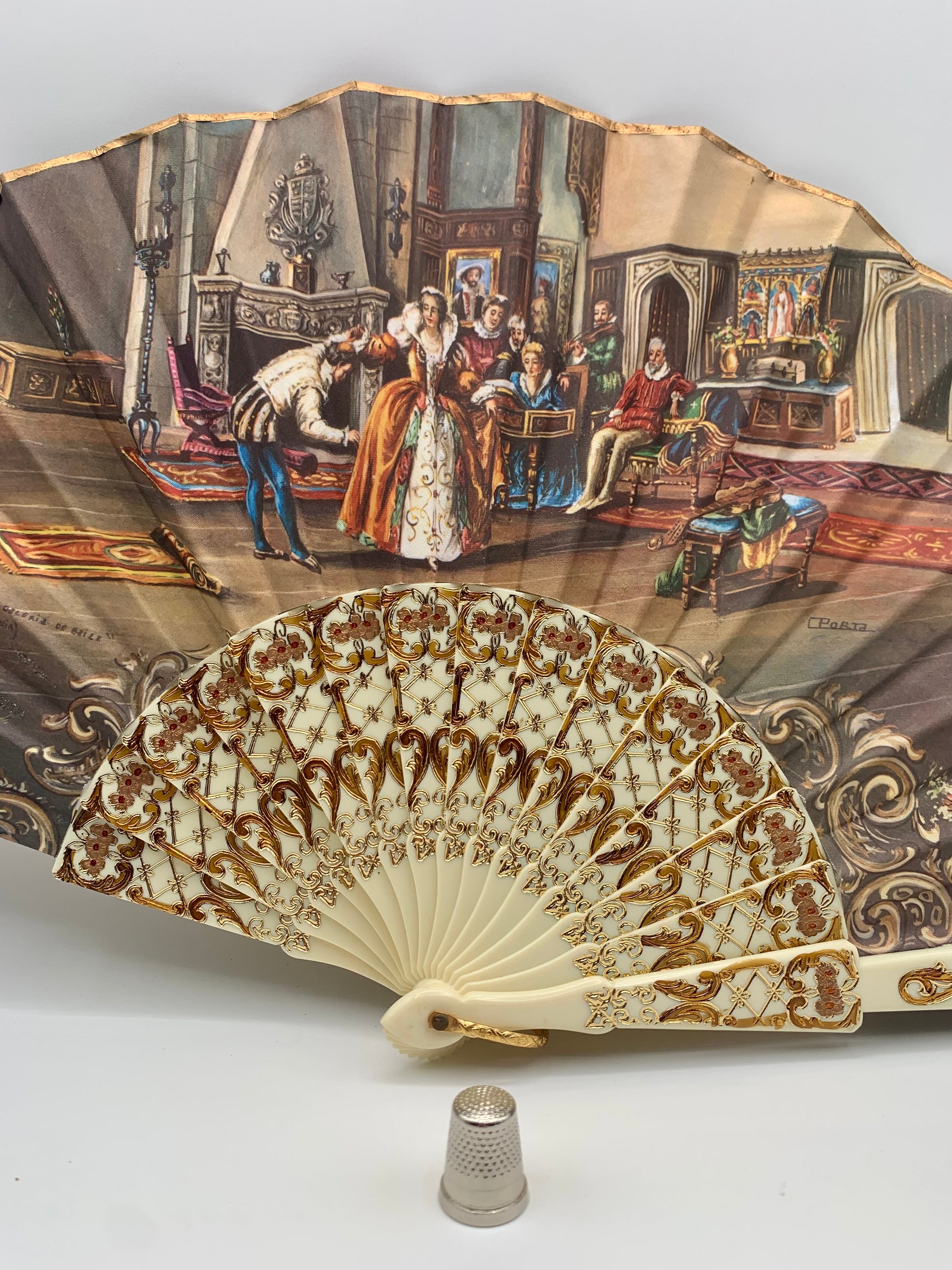 Abanico de pasta color blanco nácar e imagen de época impresa por ambas caras