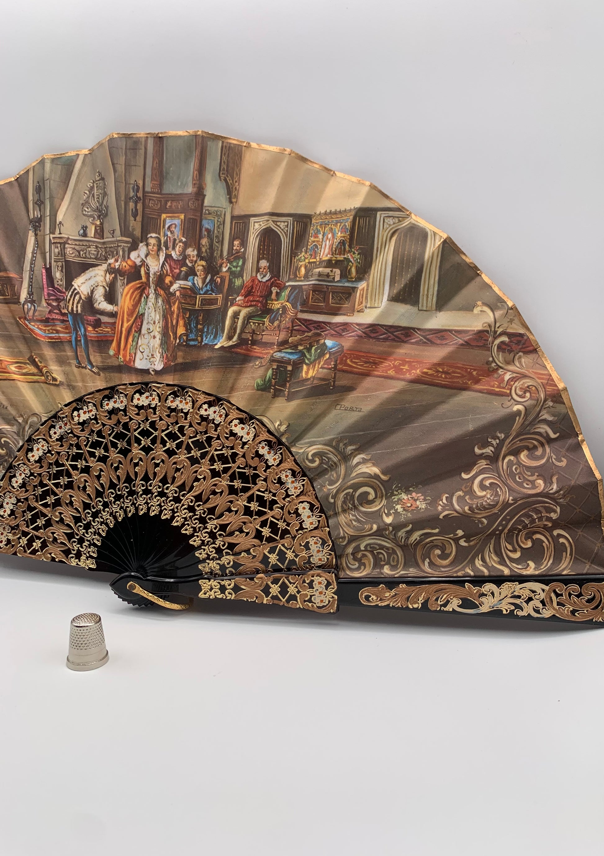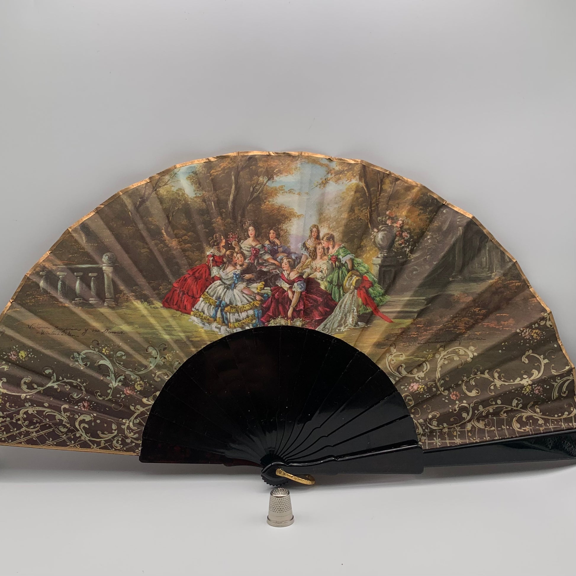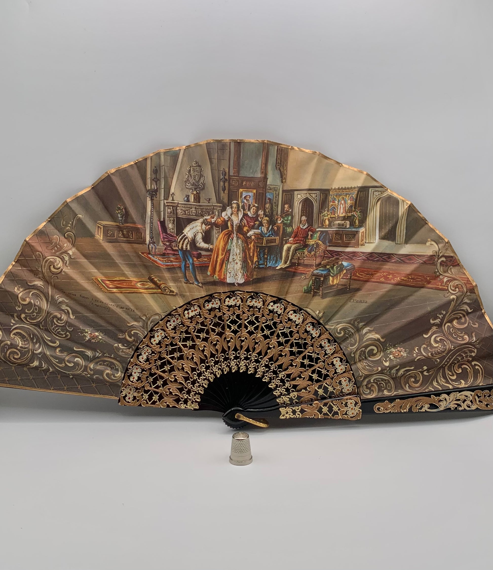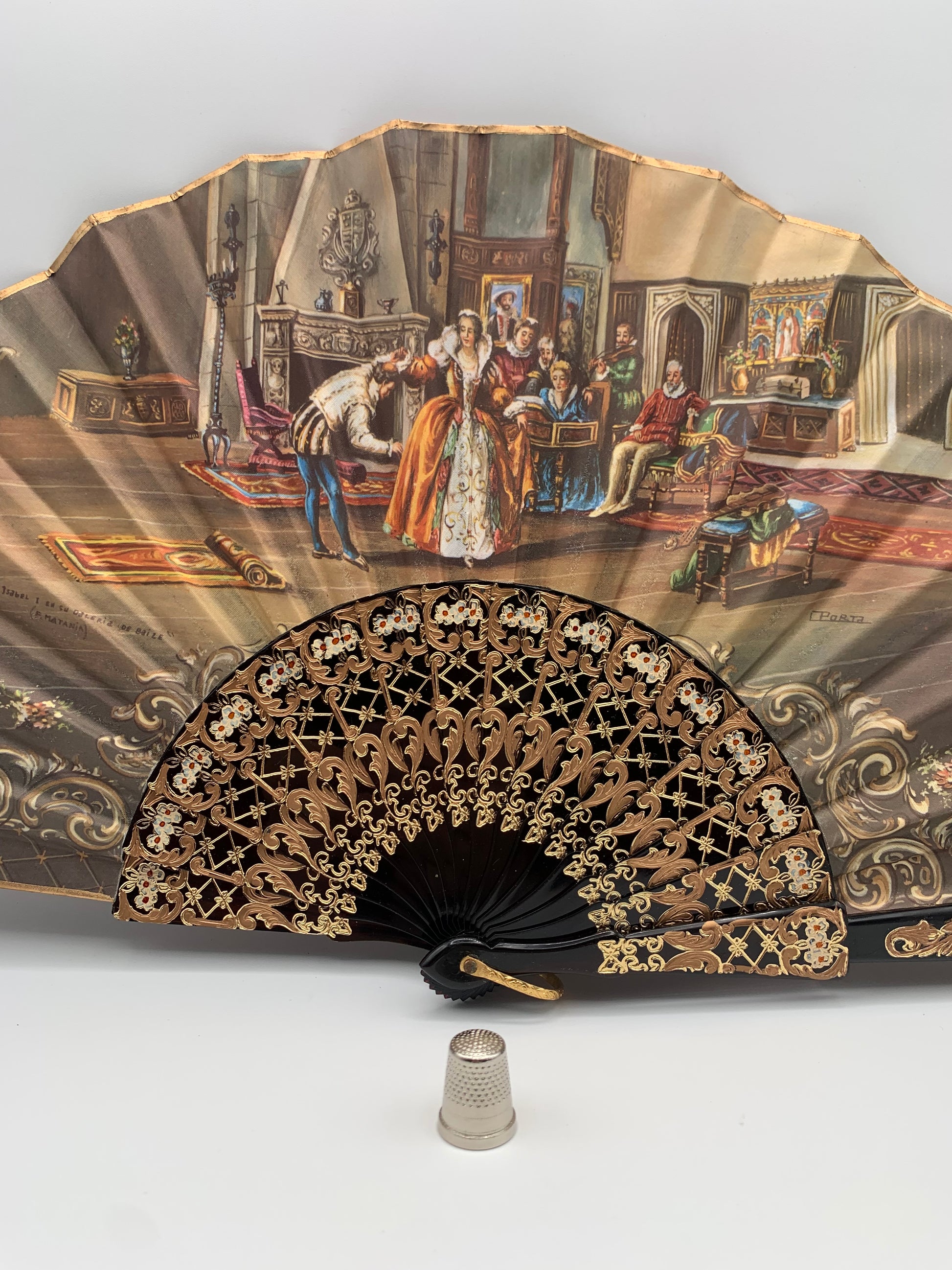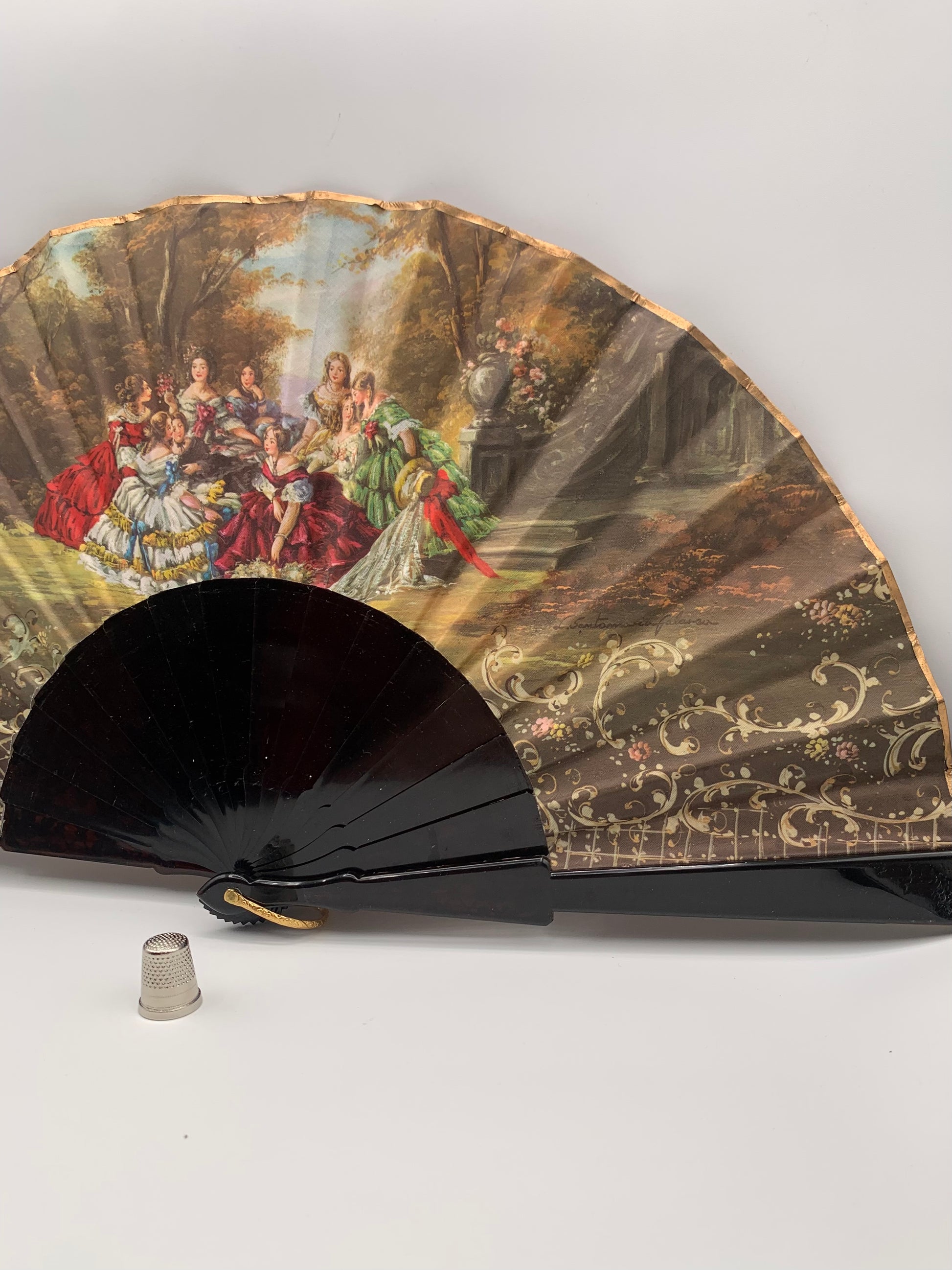 Abanico de pasta color carey e imagen de época impresa por ambas caras
