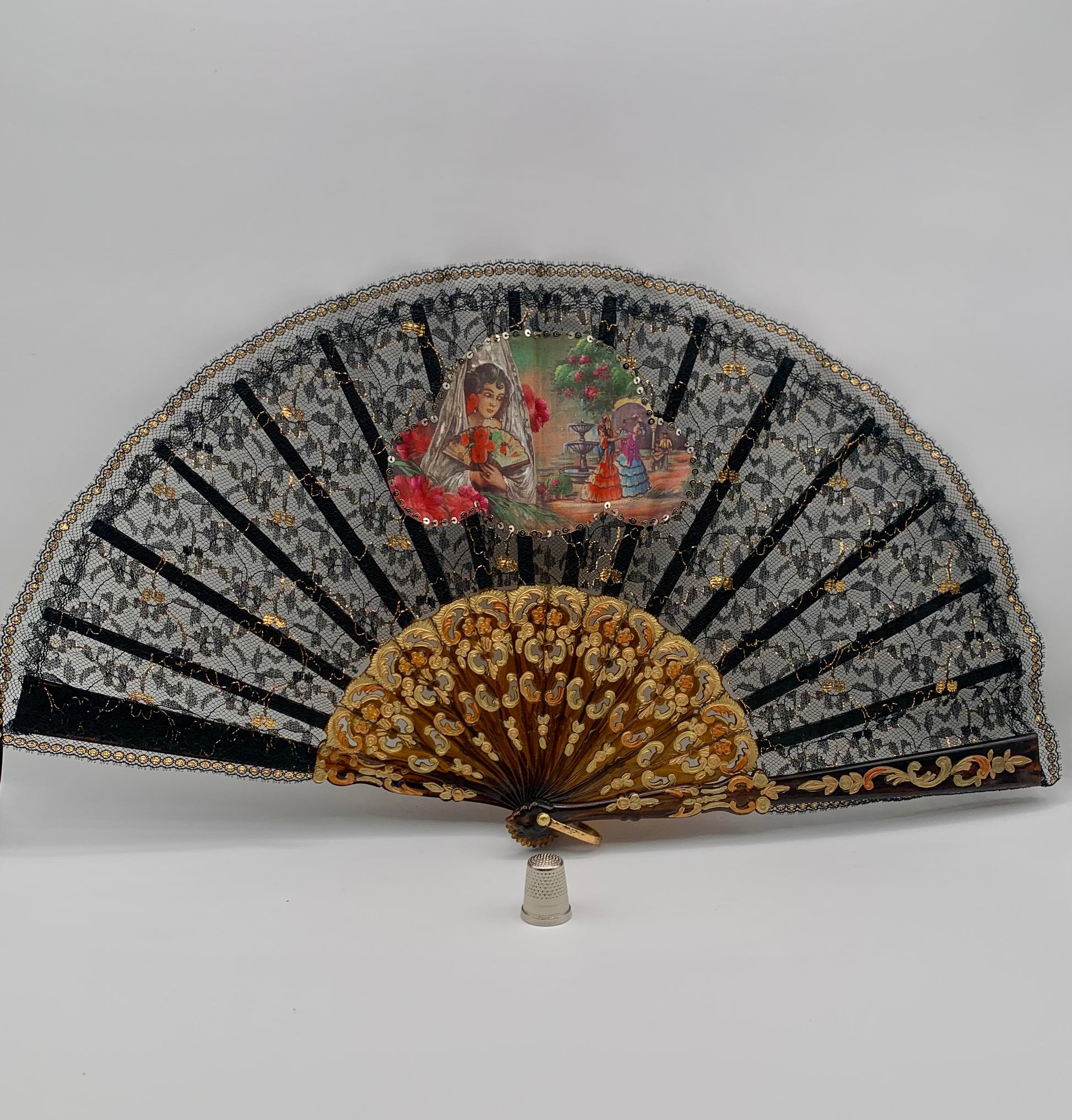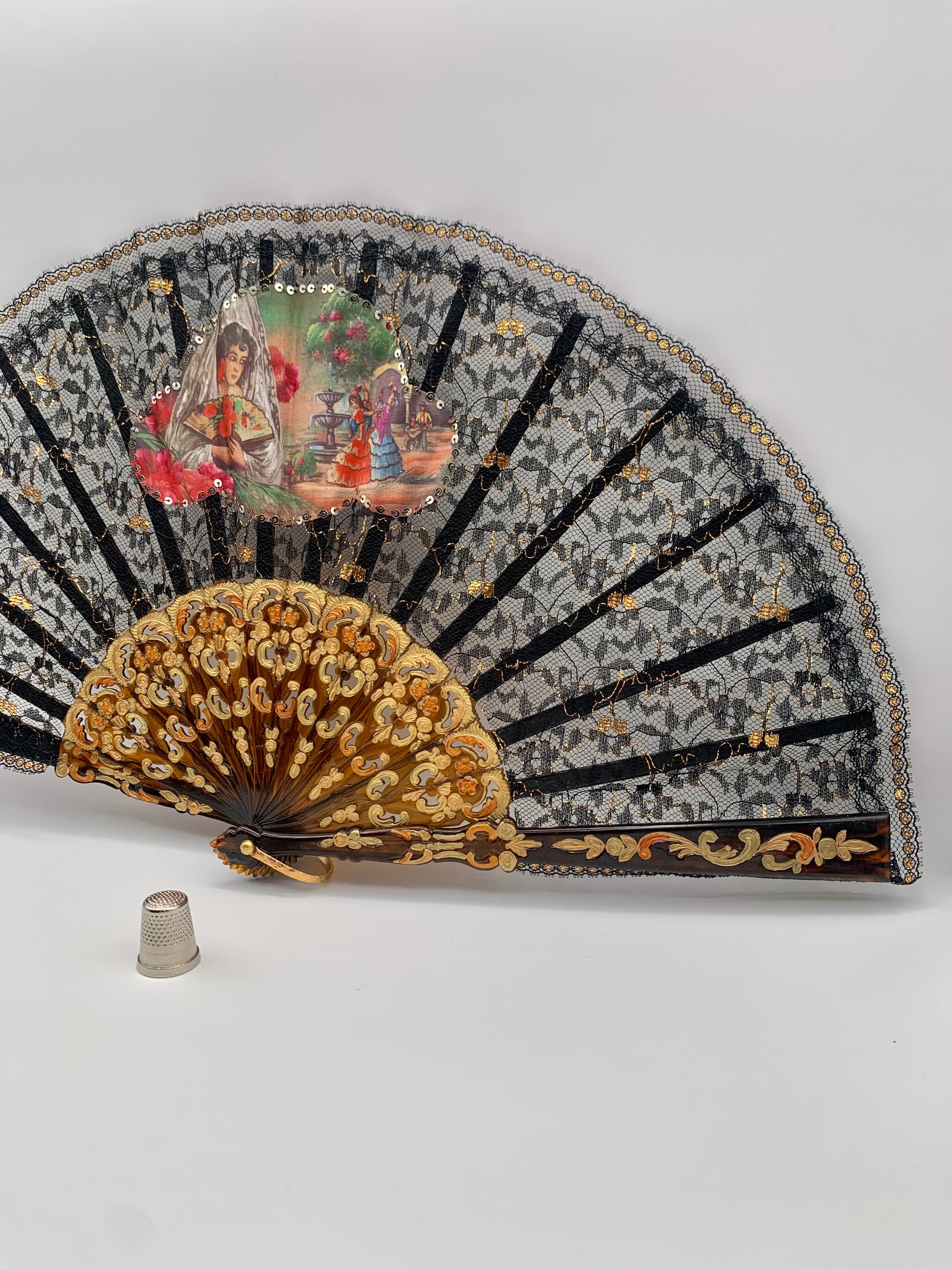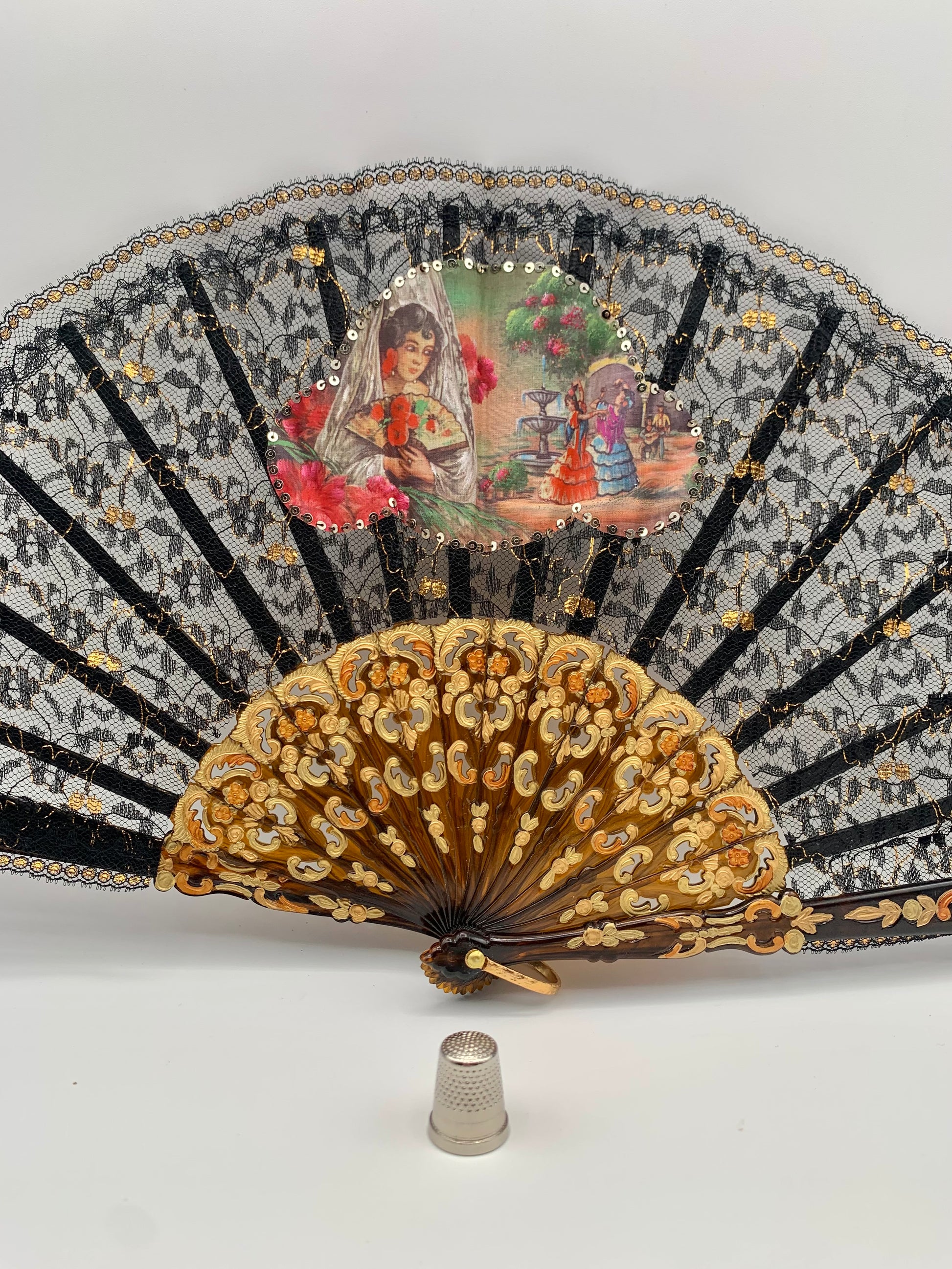 Abanico de pasta color carey, encaje negro y dorado con imagen impresa de bailaores