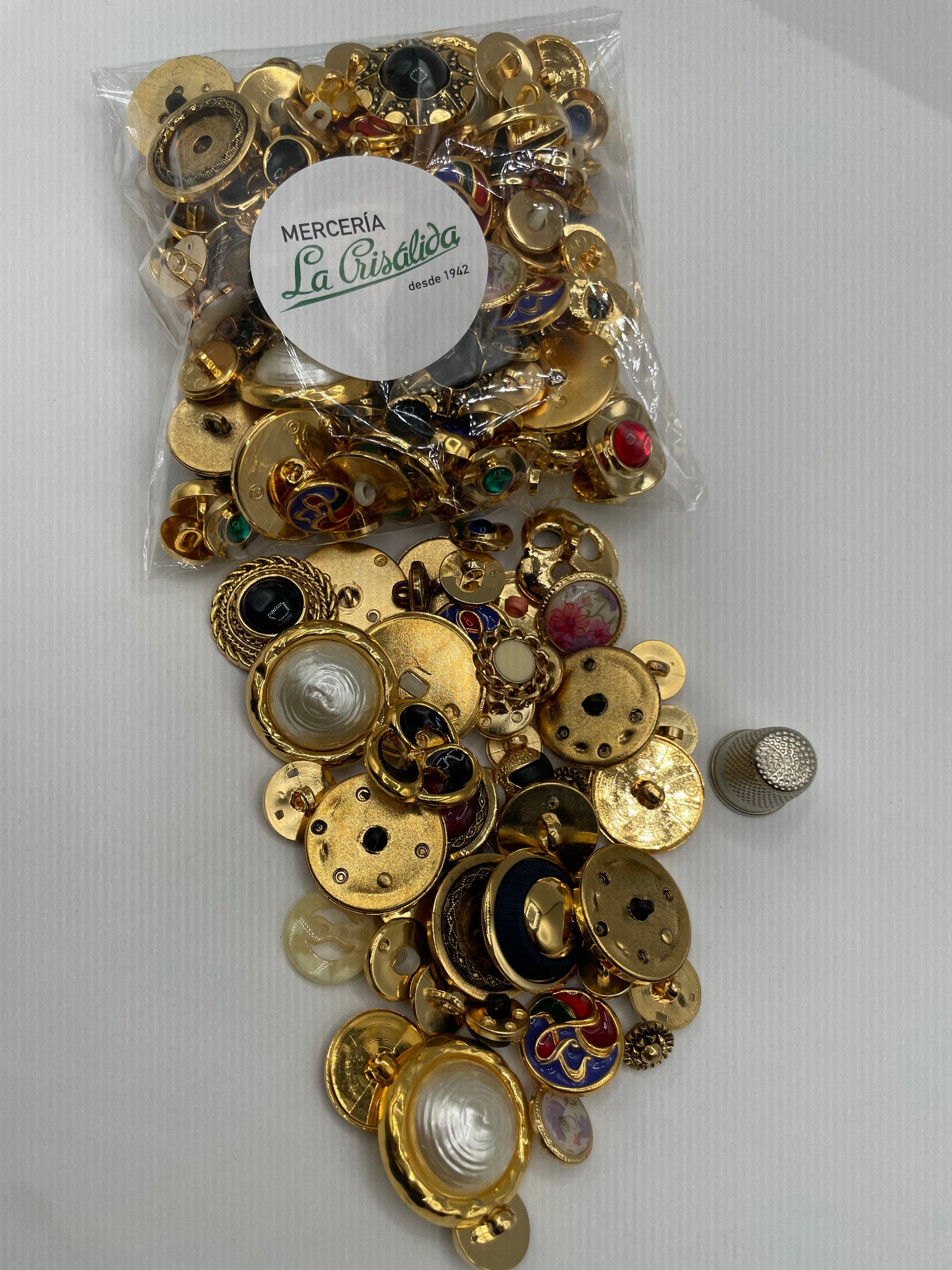 Botones surtidos de distintos materiales, colores y tamaños, todos ideales para manualidades, labores y proyectos de costura. Botones que algunos llevan desde los años 40 en La Crisálida, botones descatalogados que tenemos por la mercería y que pueden pasar a formar parte de tu colección de botones, pídelos ya.