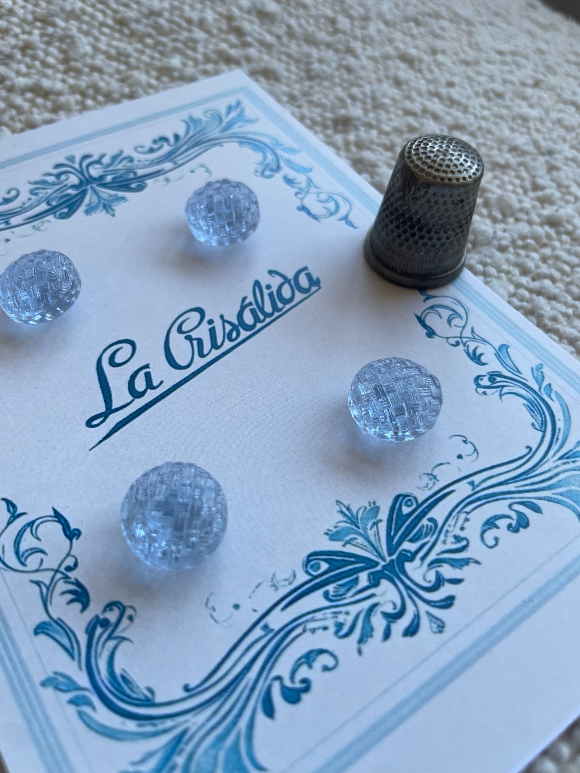 Cartón de 6 botones antiguos de vidrio, años 40, originales y exclusivos, color azul claro. Tamaño: 1,5 cm.