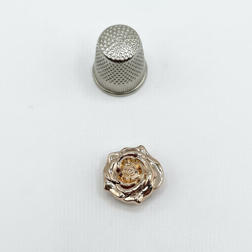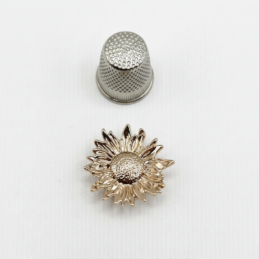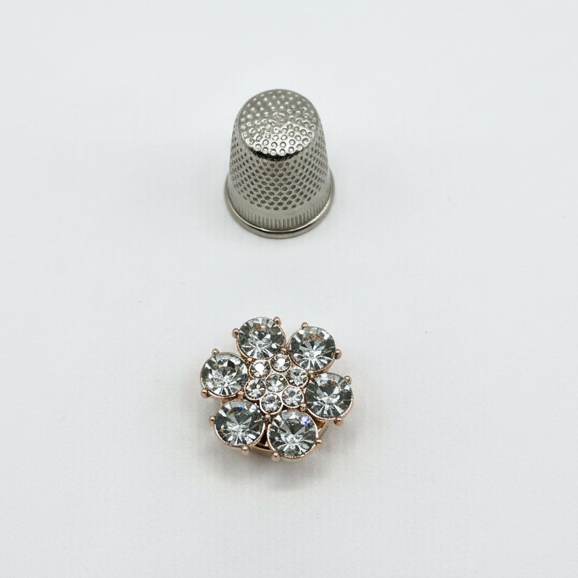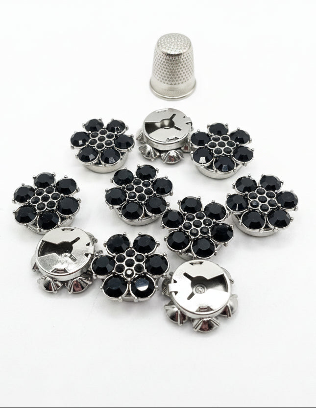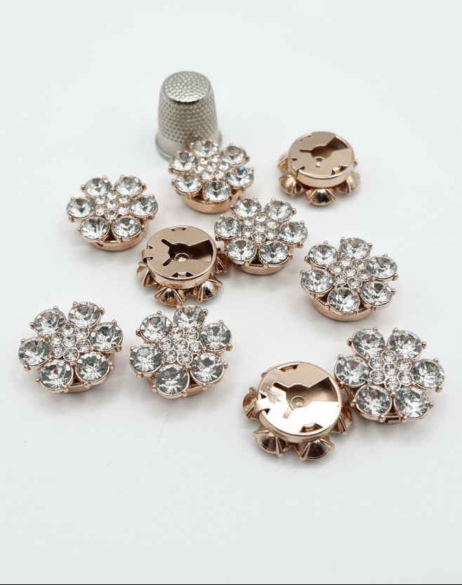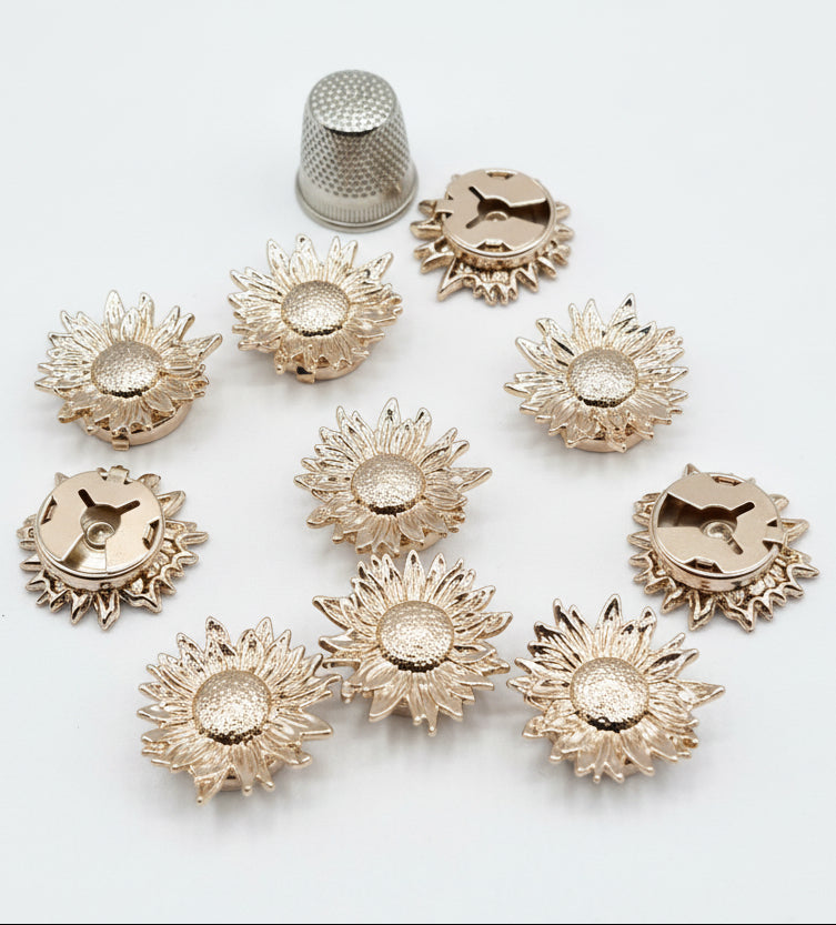 Fabricados en latón y zinc con acabados en dorado o plateado, y disponibles en cuatro formas distintas — Flor, Margarita, Rosa y Flor con pétalos de cristal — son el complemento perfecto para prendas de ropa, accesorios de bisutería y proyectos de costura creativa.