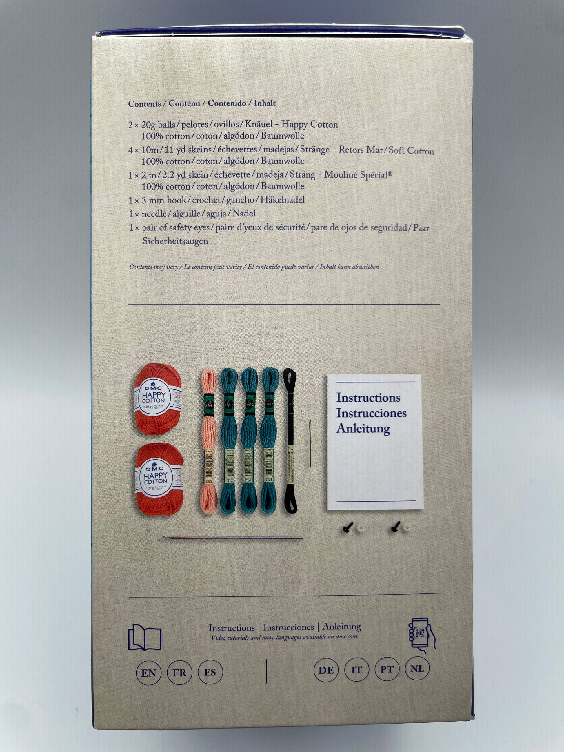 El kit contiene todo lo necesario: dos ovillos de 20 g de Happy Cotton, cuatro madejas de Retors Mat, una madeja de hilo de Mouliné Spécial, un ganchillo de 3 mm y una aguja.