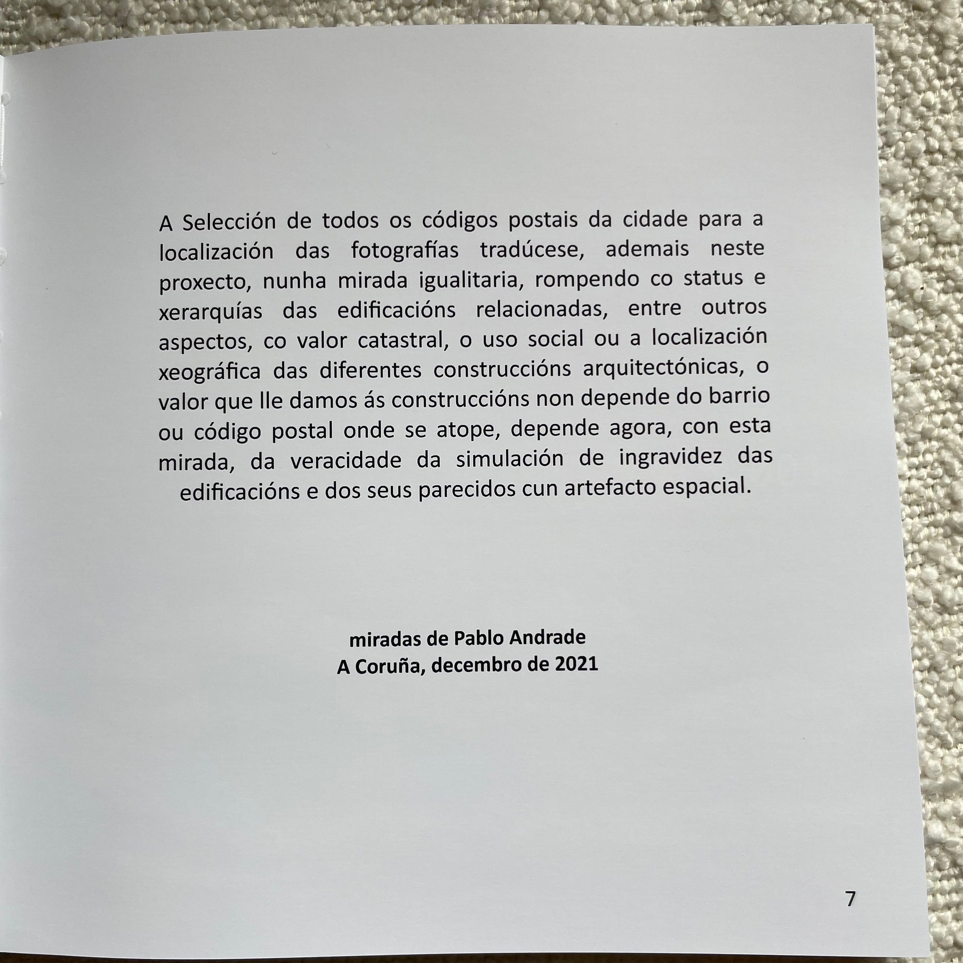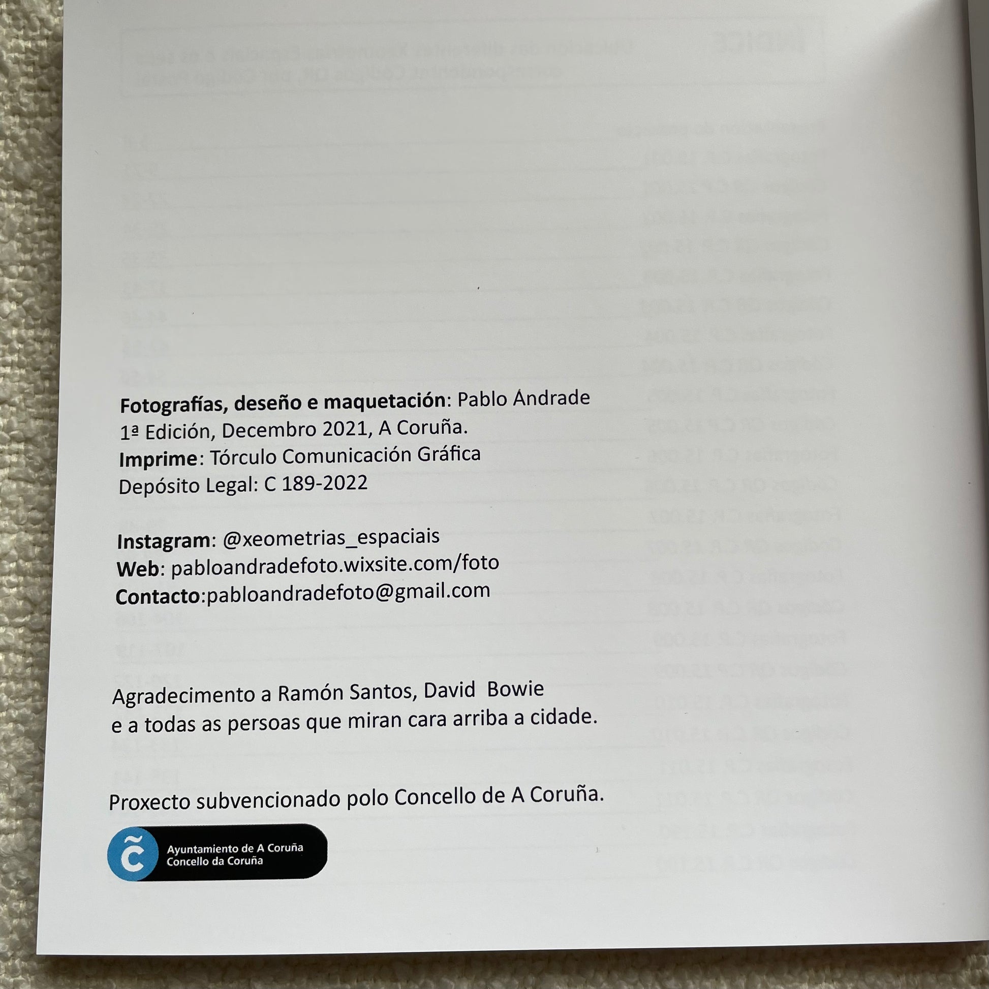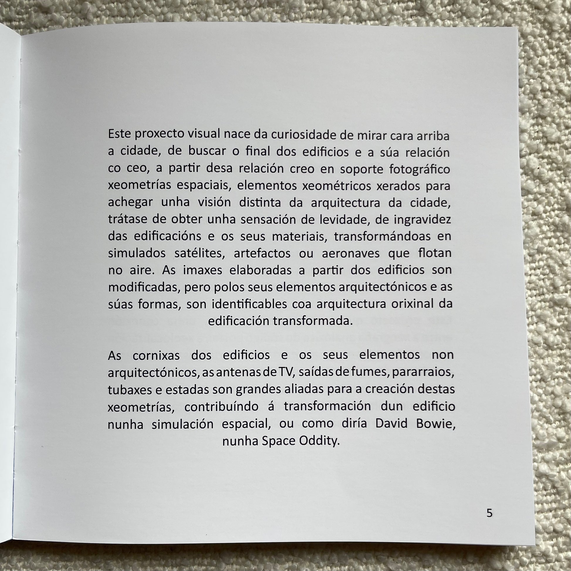 Este proxecto visual nace da curiosidade de mirar cara arriba a cidade, de buscar o final dos edificios e a súa relación co ceo, a partir desa relación creo en soporte fotográfico xeometrías espaciais, elementos xeométricos xerados para achegar unha visión distinta da arquitetura da cidade, trátase de obter unha sensación de levidade, de ingravidez das edificacións e os seus materiais, transformándoas en simulados satélites, artefactos ou aeronaves que flotan no aire. As imaxes elaboradas a partir dos edificios son modificadas, pero polos seus elementos arquitectónicos e as súas formas, son identificables coa arquitetura orixinal da edificación transformada.