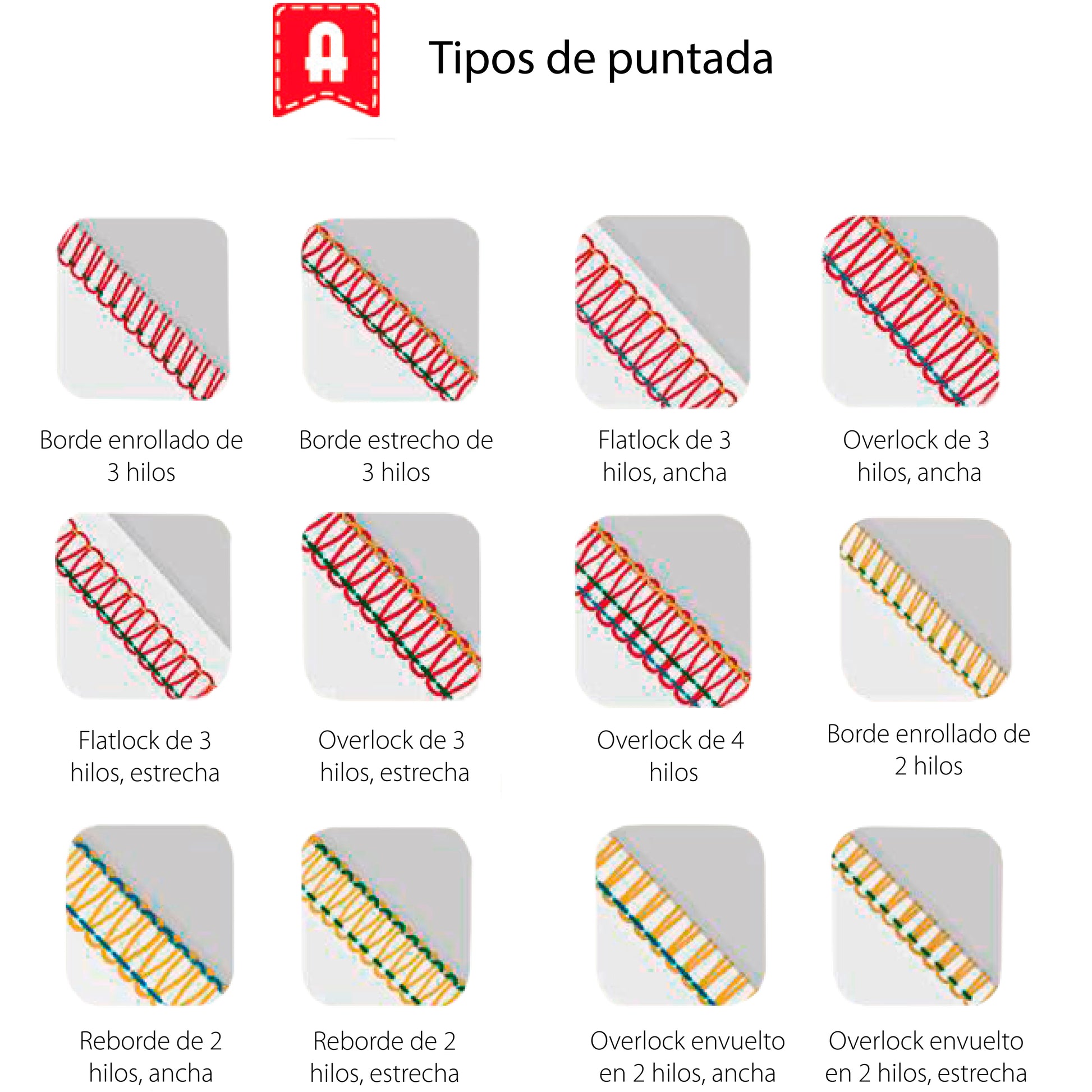 - Incluye prensatelas especiales, convertidor a 2 hilos, 4 bobinas y herramientas