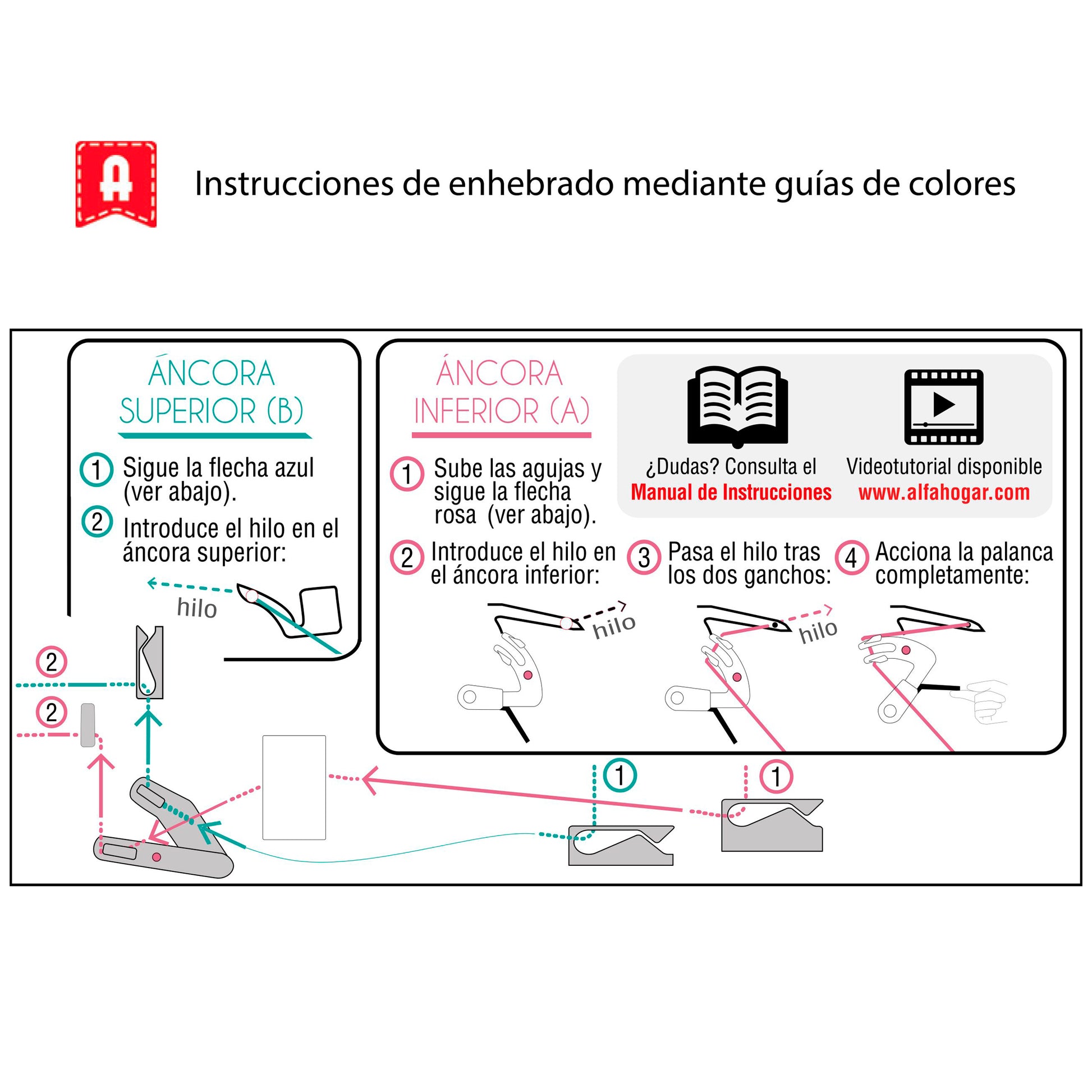 - Etiqueta de instrucciones de enhebrado mediante guías de colores y textos en castellano.