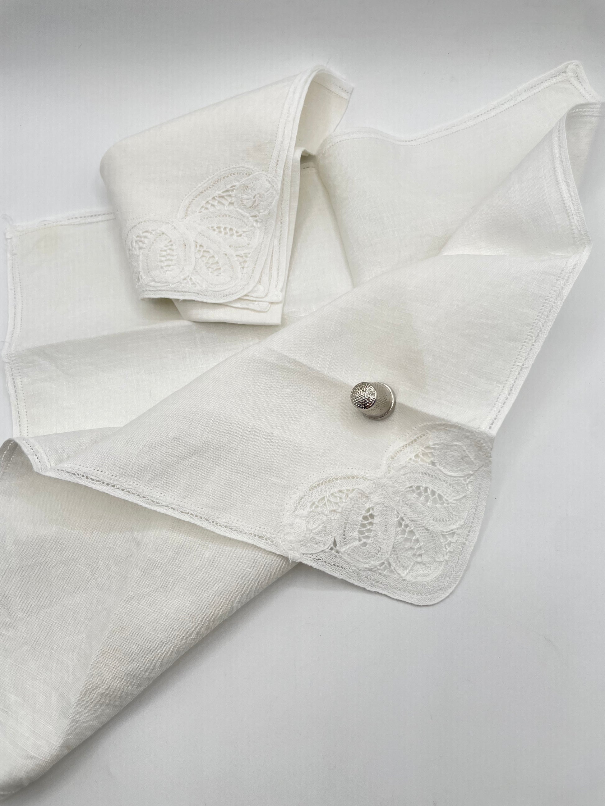 2 Servilletas de lino antiguo inciales grabadas de 37x37 cm. Utilizando la técnica de bordado de encaje Battenberg.