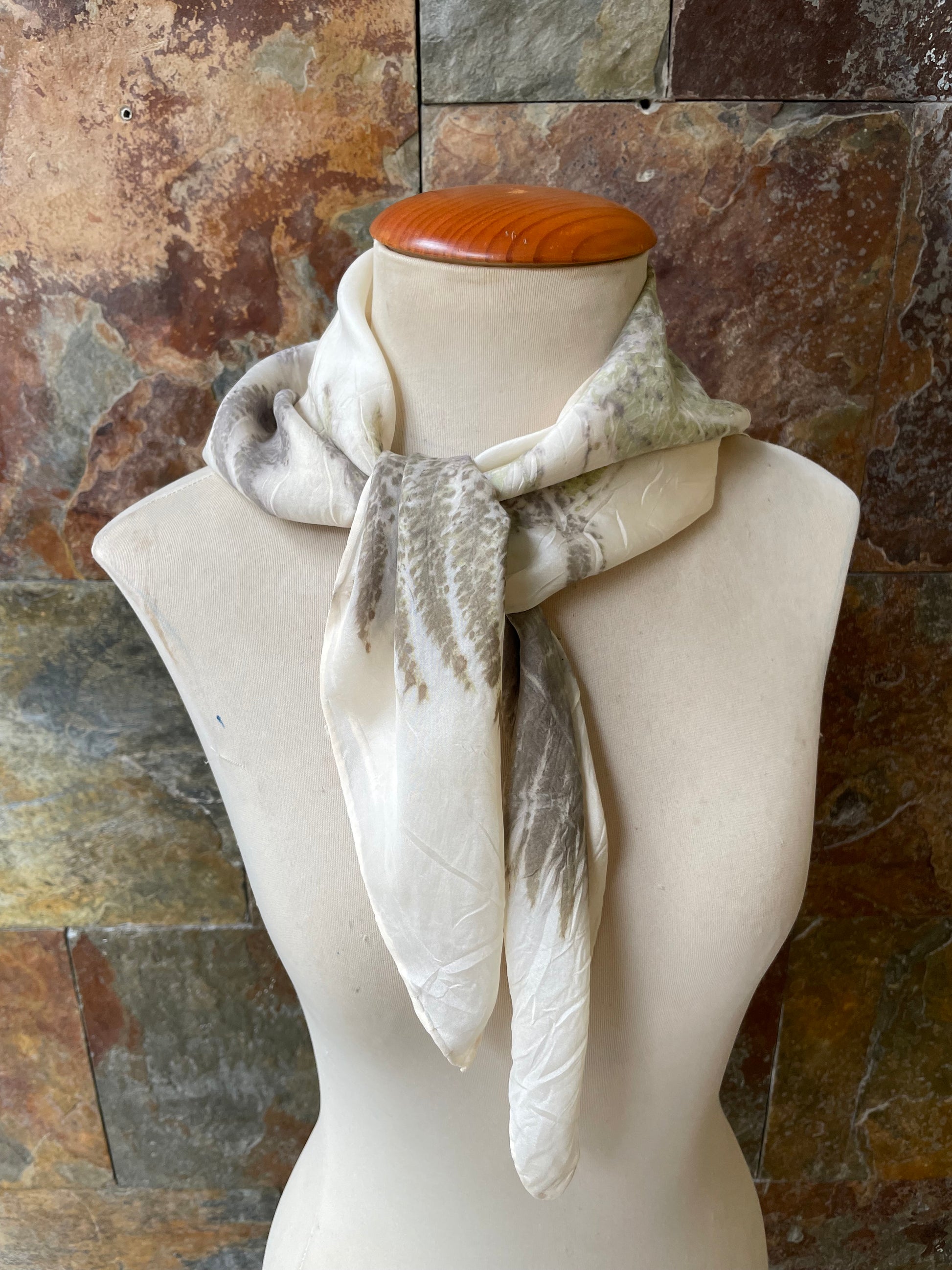 Pieza única. Pañuelo de cuello de seda 100%, creado con la exclusiva técnica de ECOPRINT por Ramón Santos. Cada pieza es única, realizada a mano con tintes naturales que capturan patrones y colores inspirados en la naturaleza. Ideal para añadir un toque de elegancia y originalidad a cualquier estilo, este pañuelo ecológico resalta la belleza de la seda en su forma más pura.