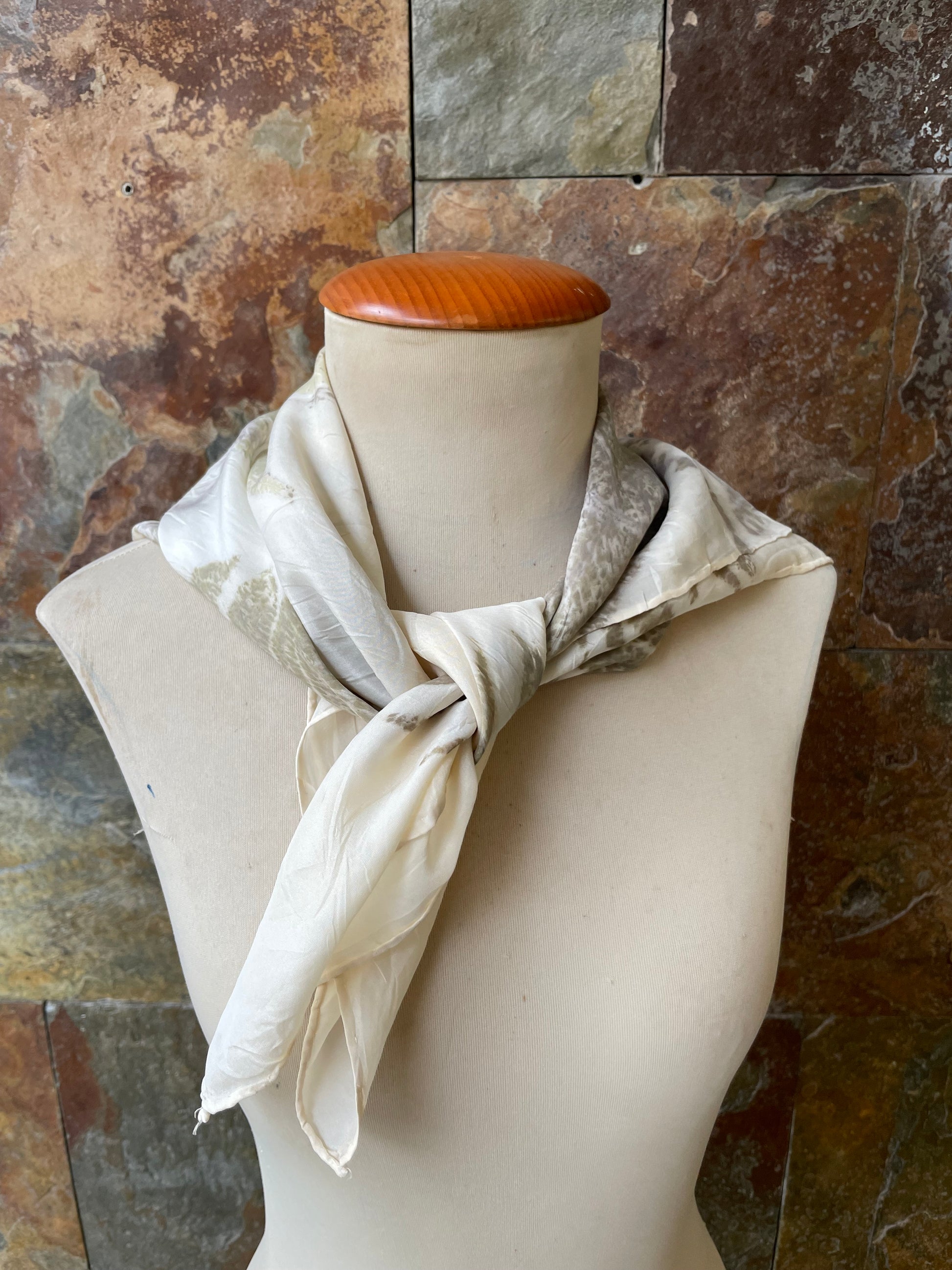 Pieza única. Pañuelo de cuello de seda 100%, creado con la exclusiva técnica de ECOPRINT por Ramón Santos. Cada pieza es única, realizada a mano con tintes naturales que capturan patrones y colores inspirados en la naturaleza. Ideal para añadir un toque de elegancia y originalidad a cualquier estilo, este pañuelo ecológico resalta la belleza de la seda en su forma más pura.