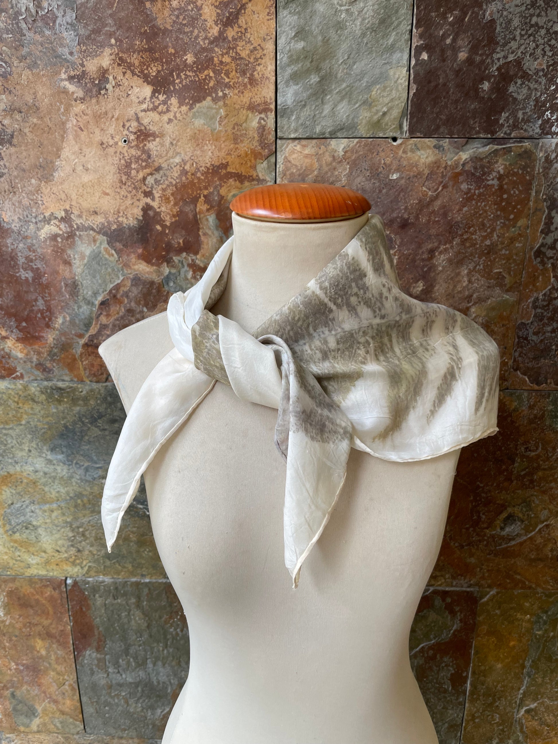Pieza única. Pañuelo de cuello de seda 100%, creado con la exclusiva técnica de ECOPRINT por Ramón Santos. Cada pieza es única, realizada a mano con tintes naturales que capturan patrones y colores inspirados en la naturaleza. Ideal para añadir un toque de elegancia y originalidad a cualquier estilo, este pañuelo ecológico resalta la belleza de la seda en su forma más pura.