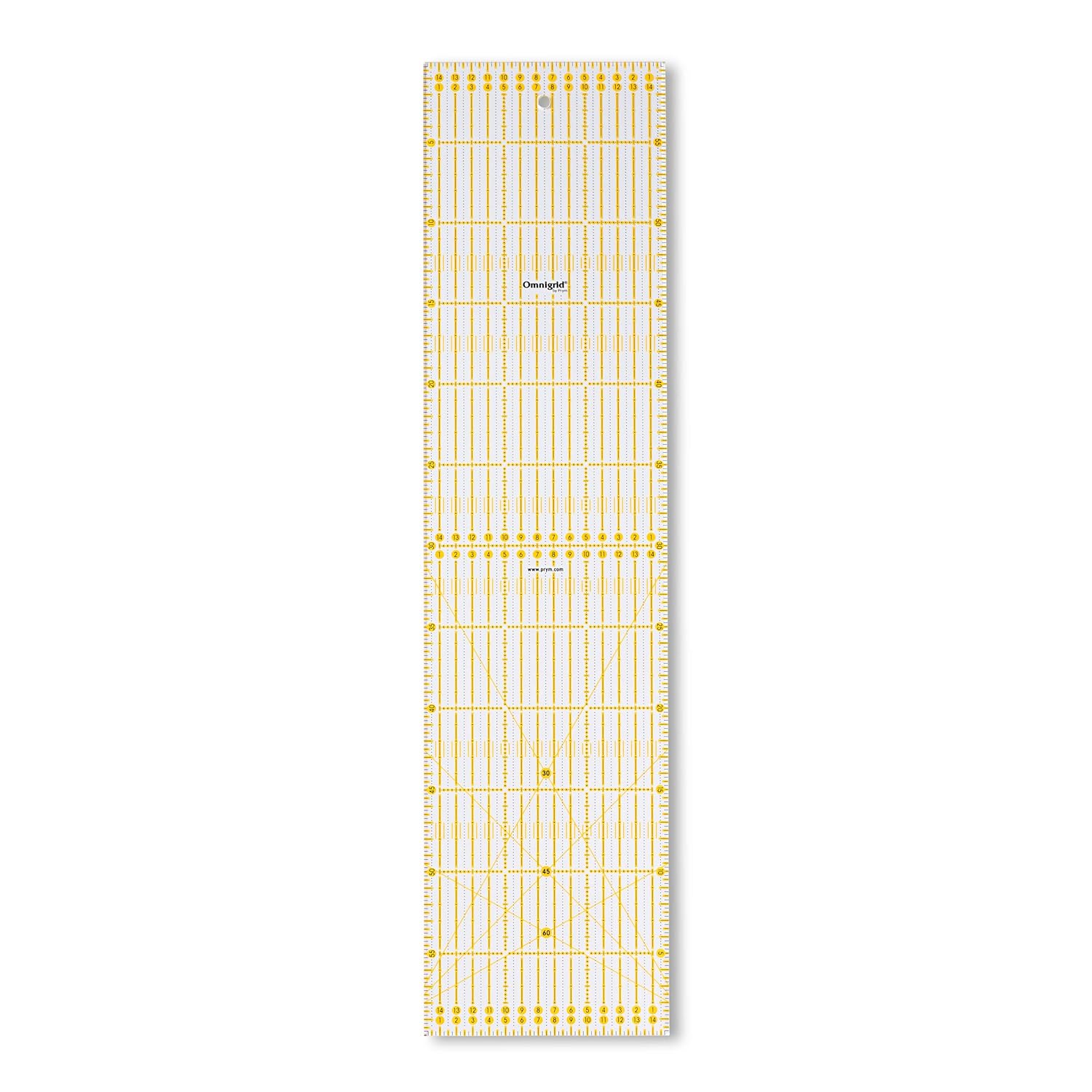 La regla Universal Omnigrid PRYM con marcas de cuadrícula negras y amarillas es perfecta para usar en la mesa de corte o en la máquina de coser.