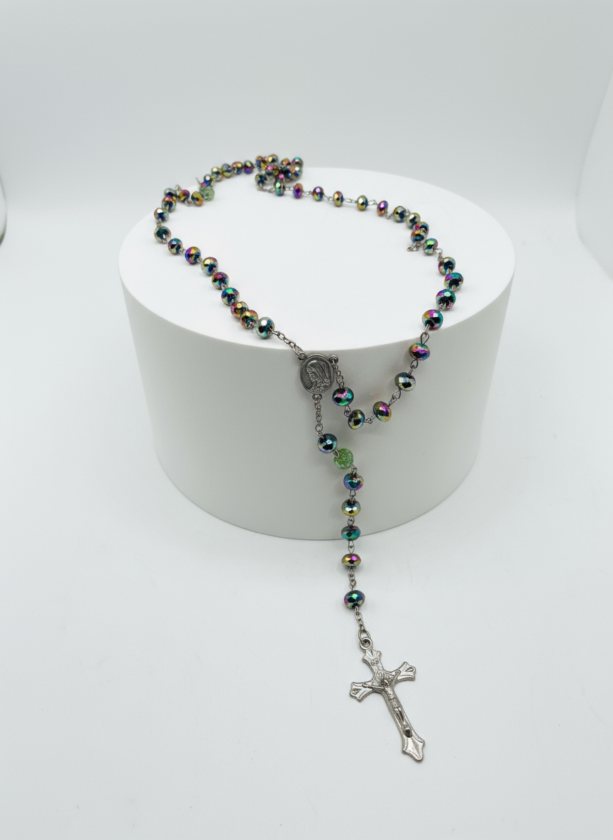 Colorido y exclusivo rosario vintage con cuentas verdes irisadas. Se le han sustituido 2 cuentas originales.