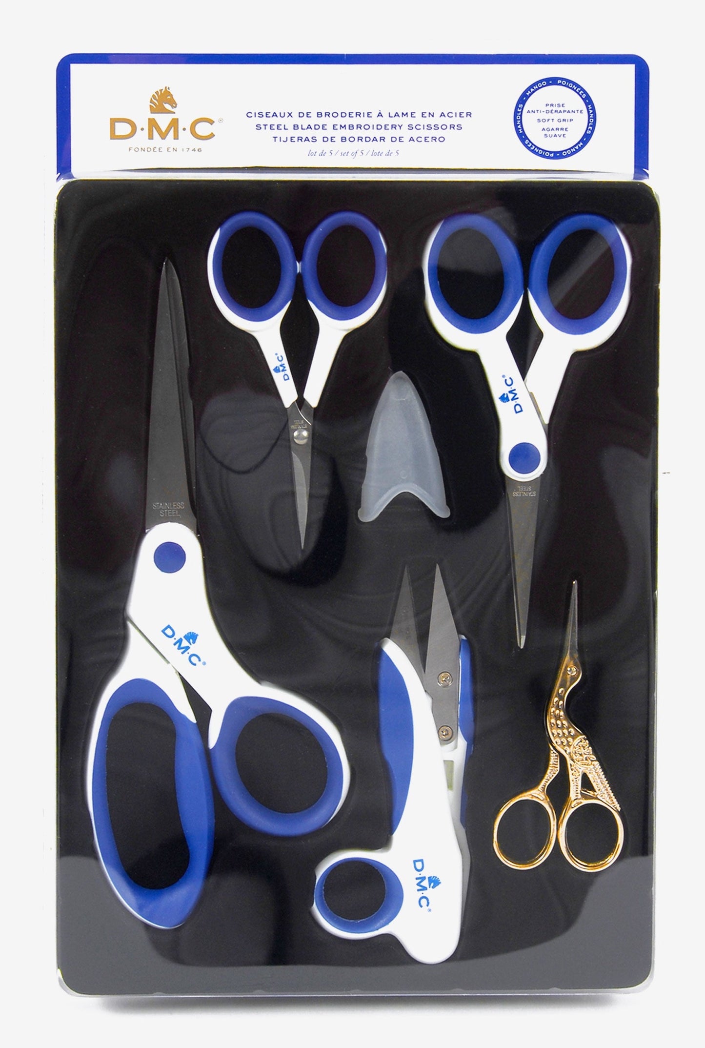 Set de tijeras multiusos DMC, el pack contiene: - 1 par de tijeras Cigüeña dorada de 9cm. - 1 corta hilos de 10 cm, de agarre suave. - 2 pares de tijeras de costura de 12,5cm y 20cm, agarre suave. - 1 par de tijeras de bordado de 10cm, agarre suave.